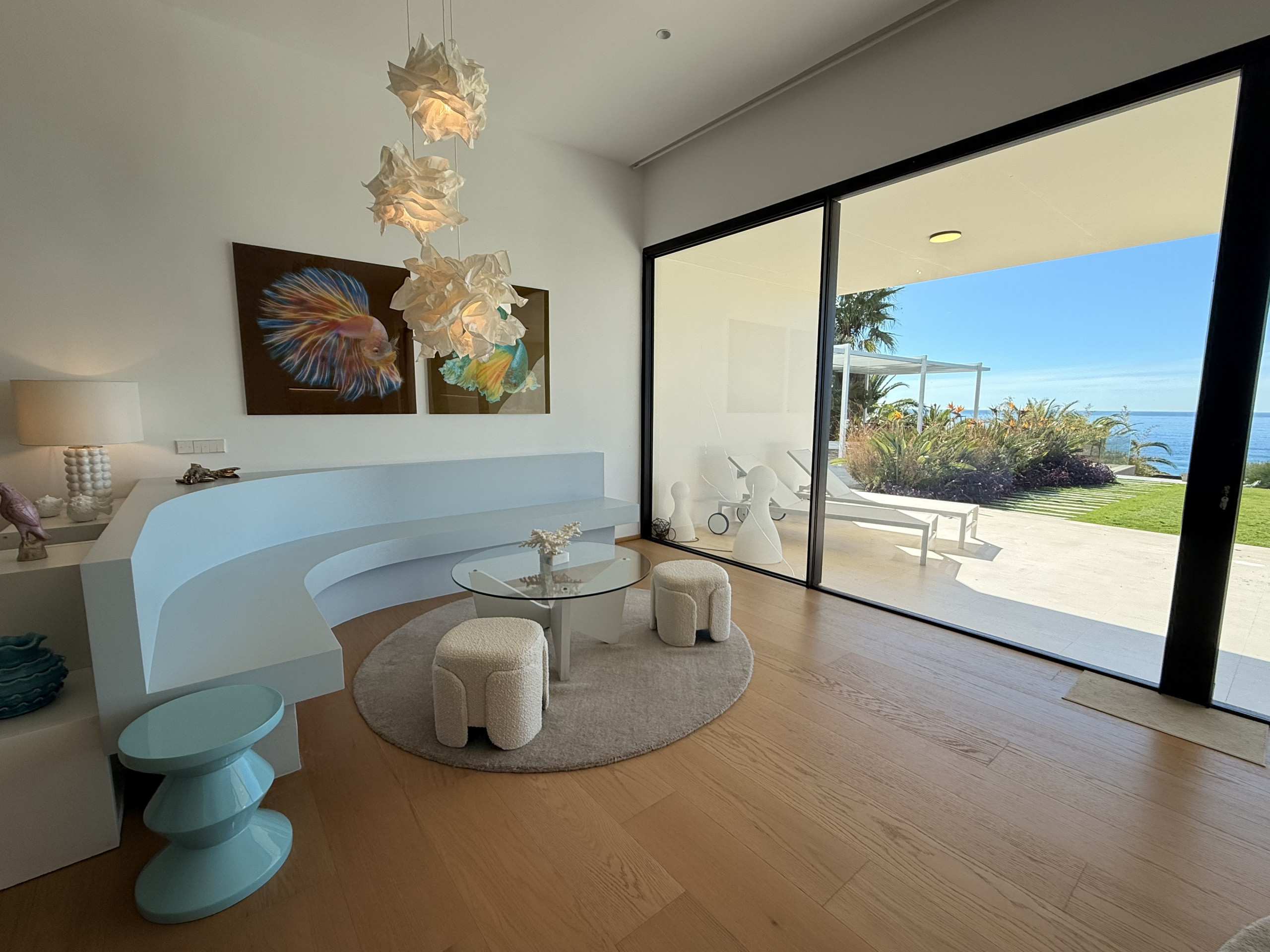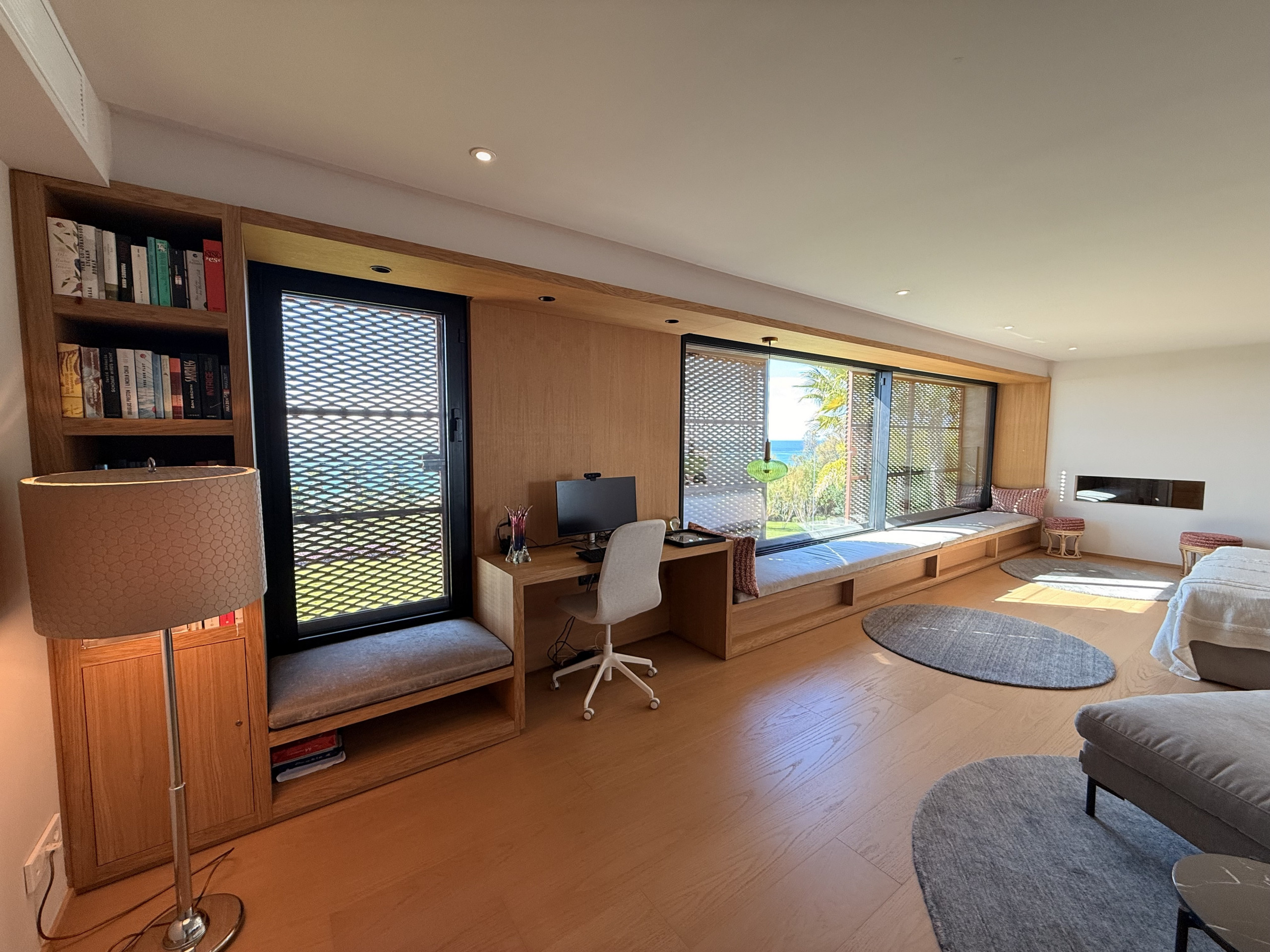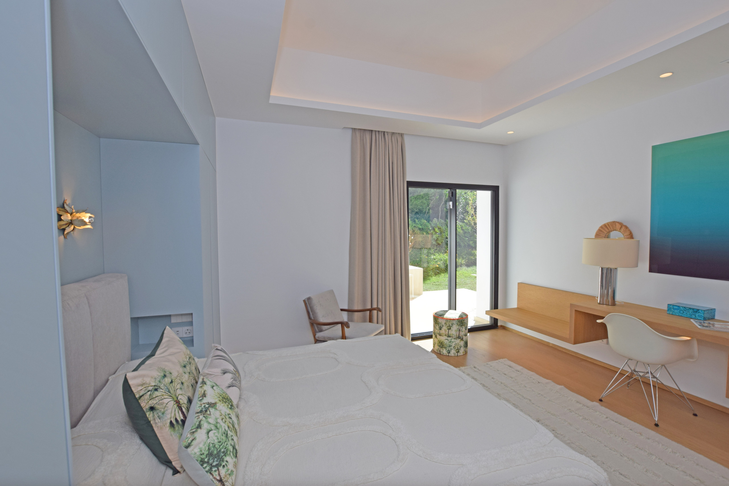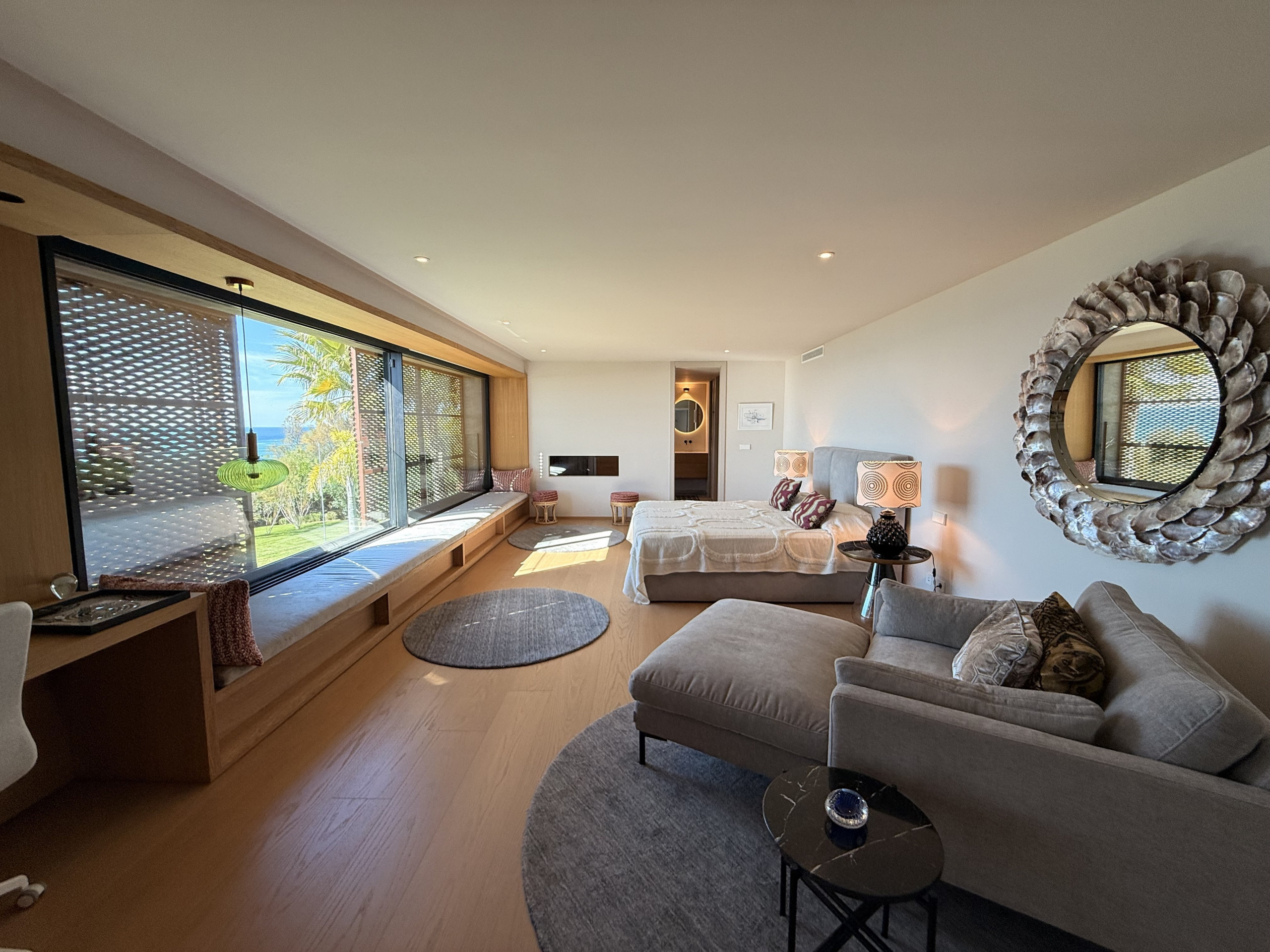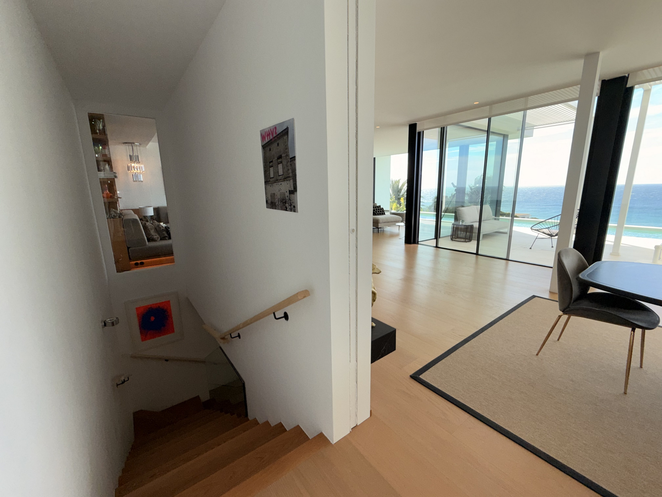 Über eine elegante Treppe gelangen Sie in die untere Etage, die intelligent gestaltet ist, um Privatsphäre und verschiedene Freizeitbereiche zu bieten – alle mit Zugang zum üppigen Garten und Meer.