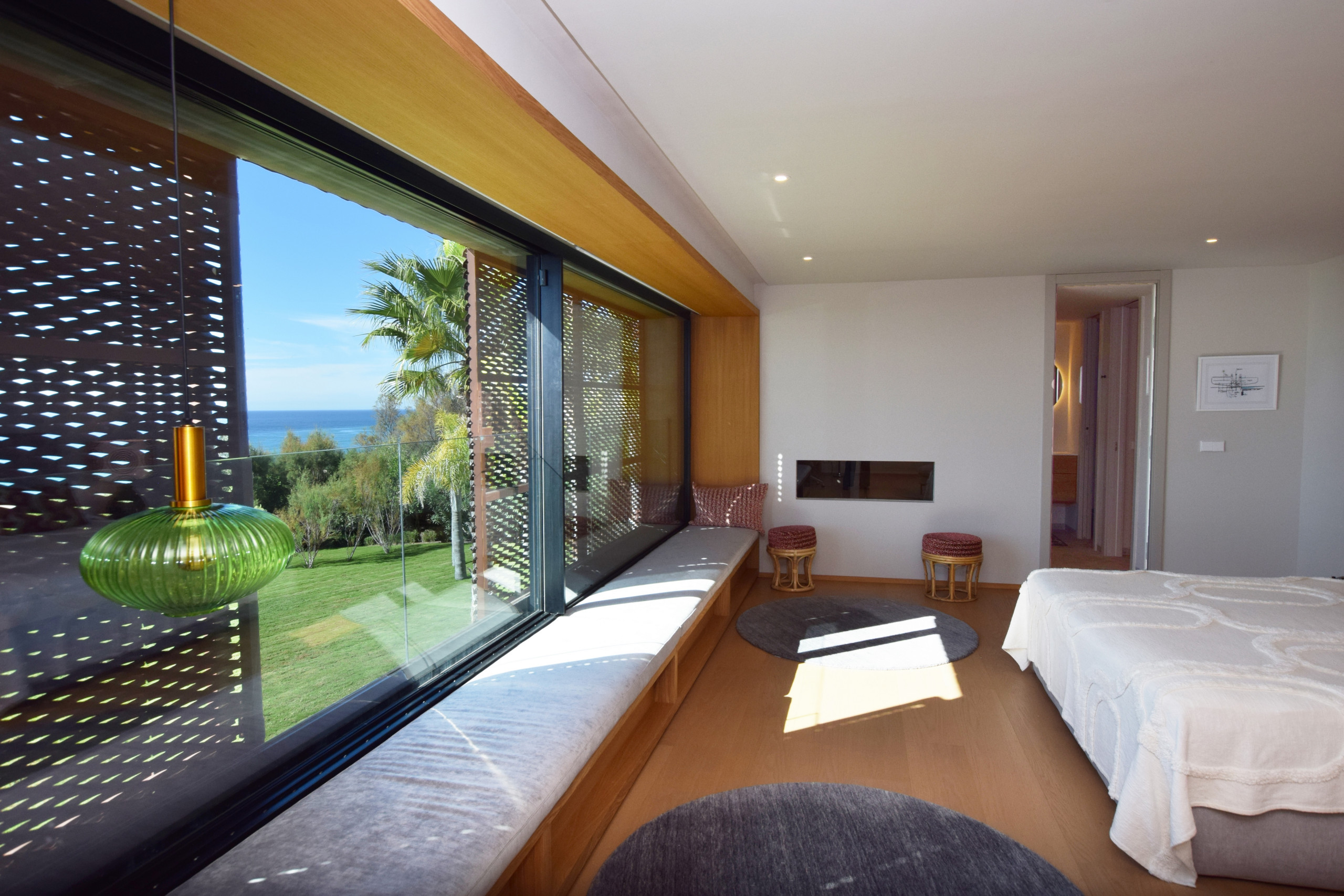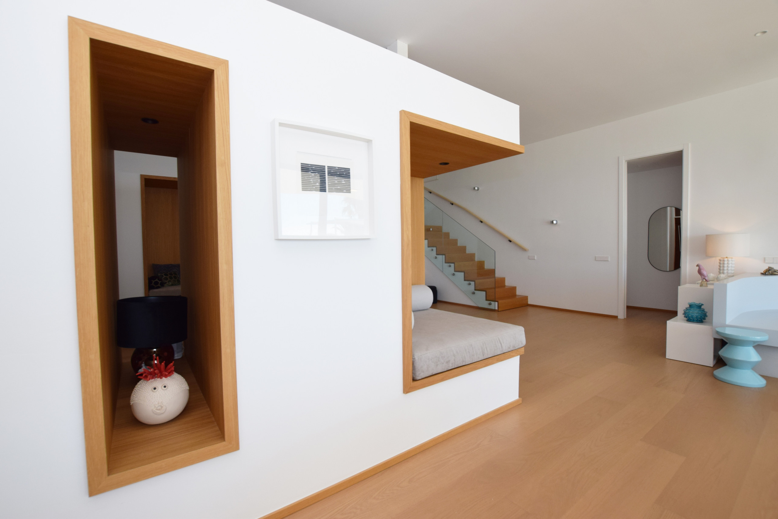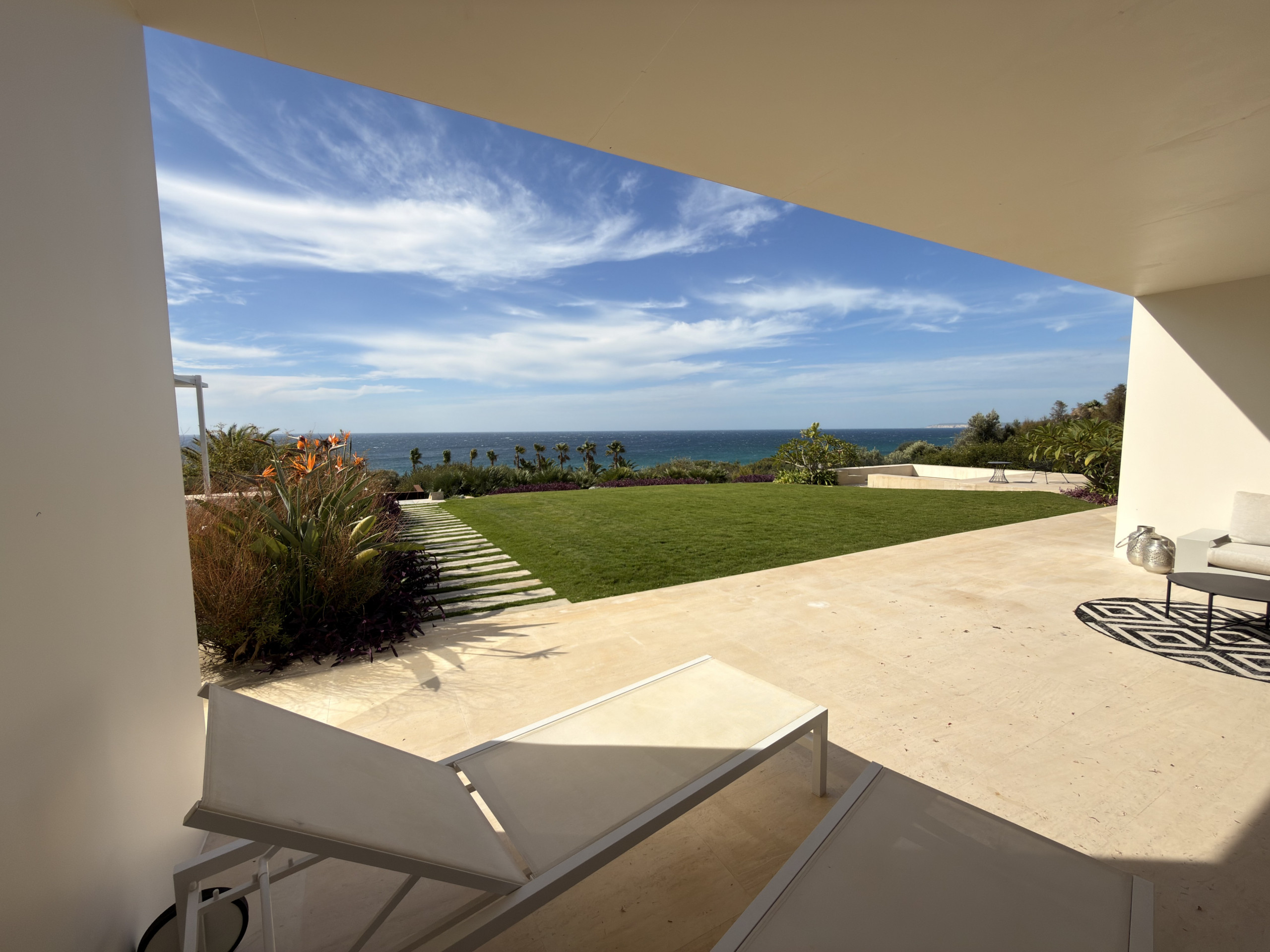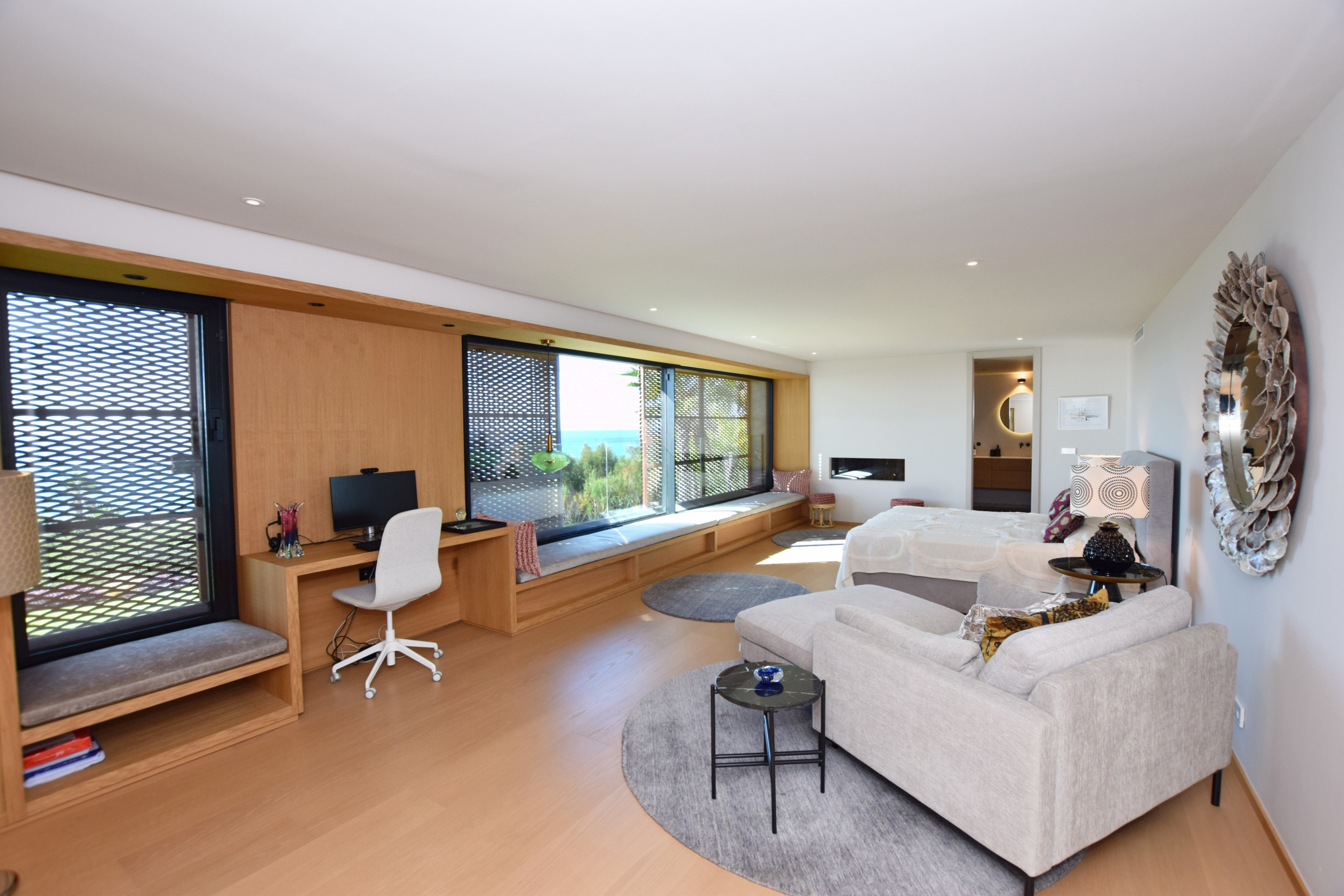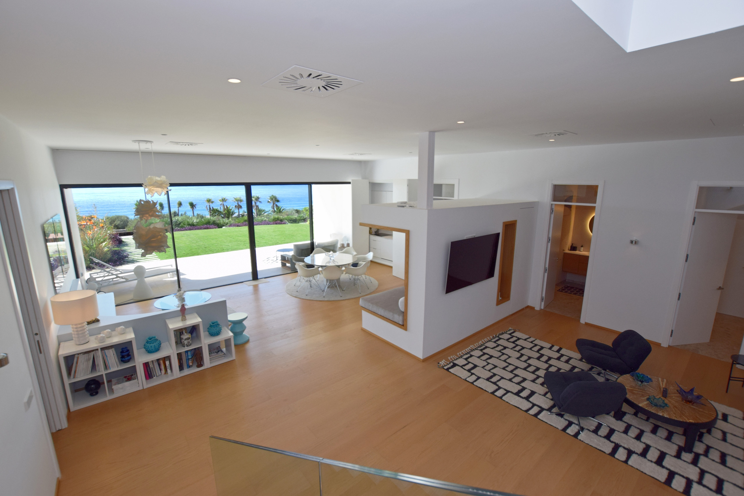 Über eine elegante Treppe gelangen Sie in die untere Etage, die intelligent gestaltet ist, um Privatsphäre und verschiedene Freizeitbereiche zu bieten – alle mit Zugang zum üppigen Garten und Meer.
