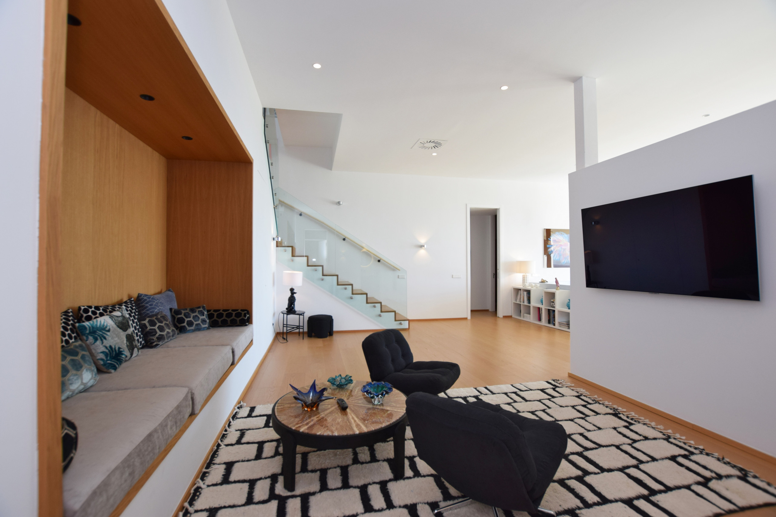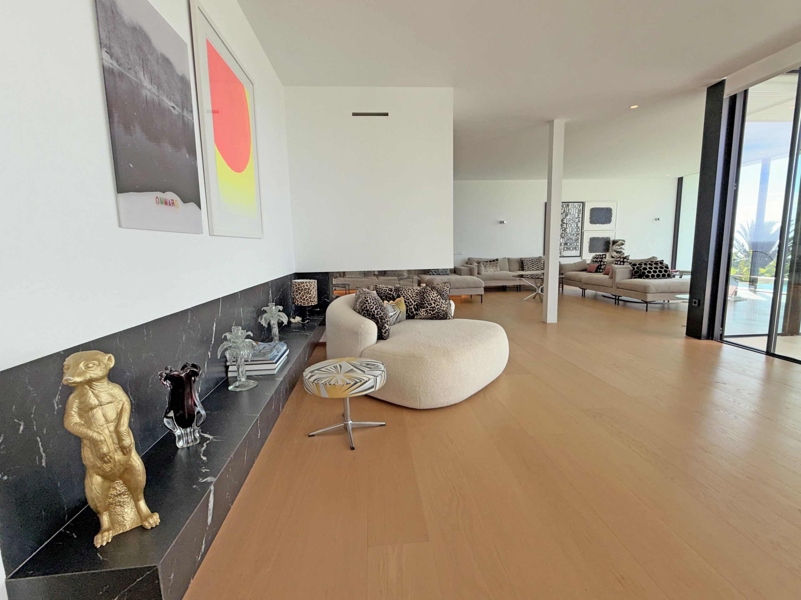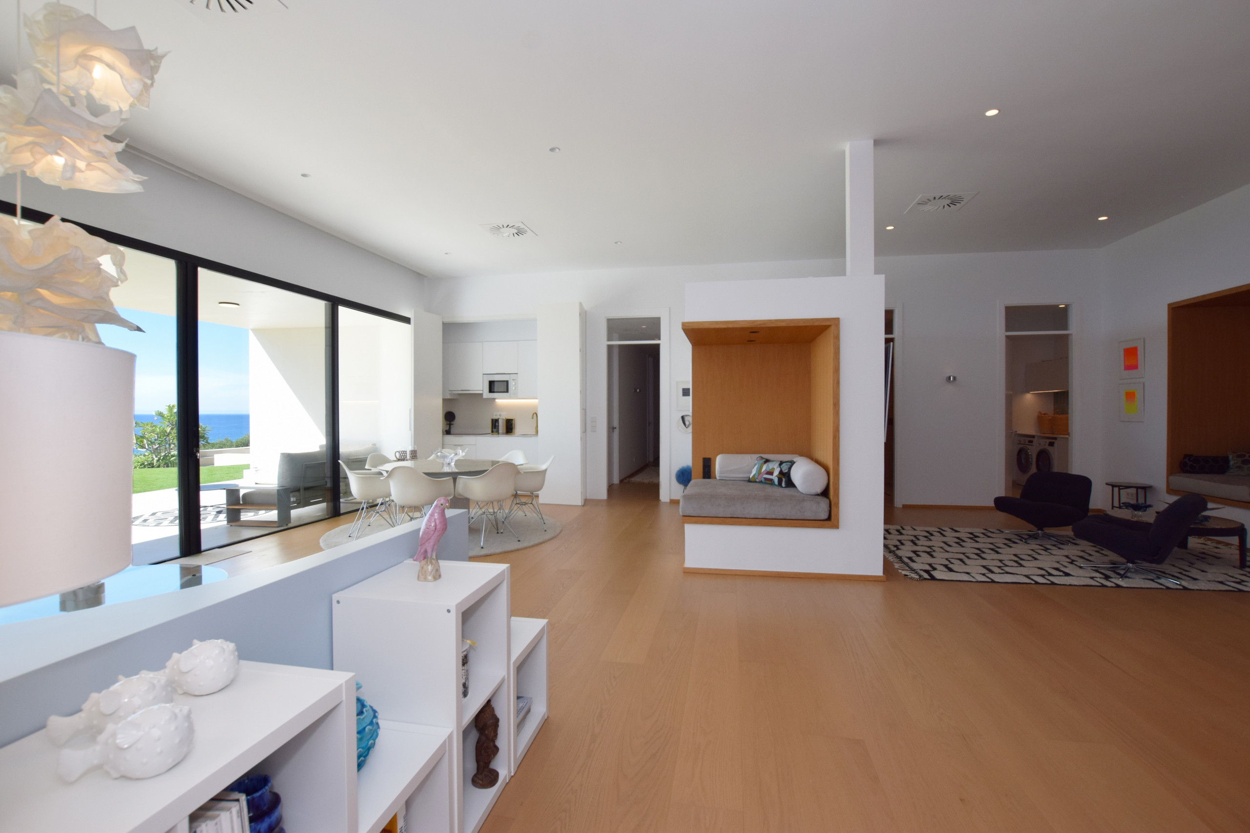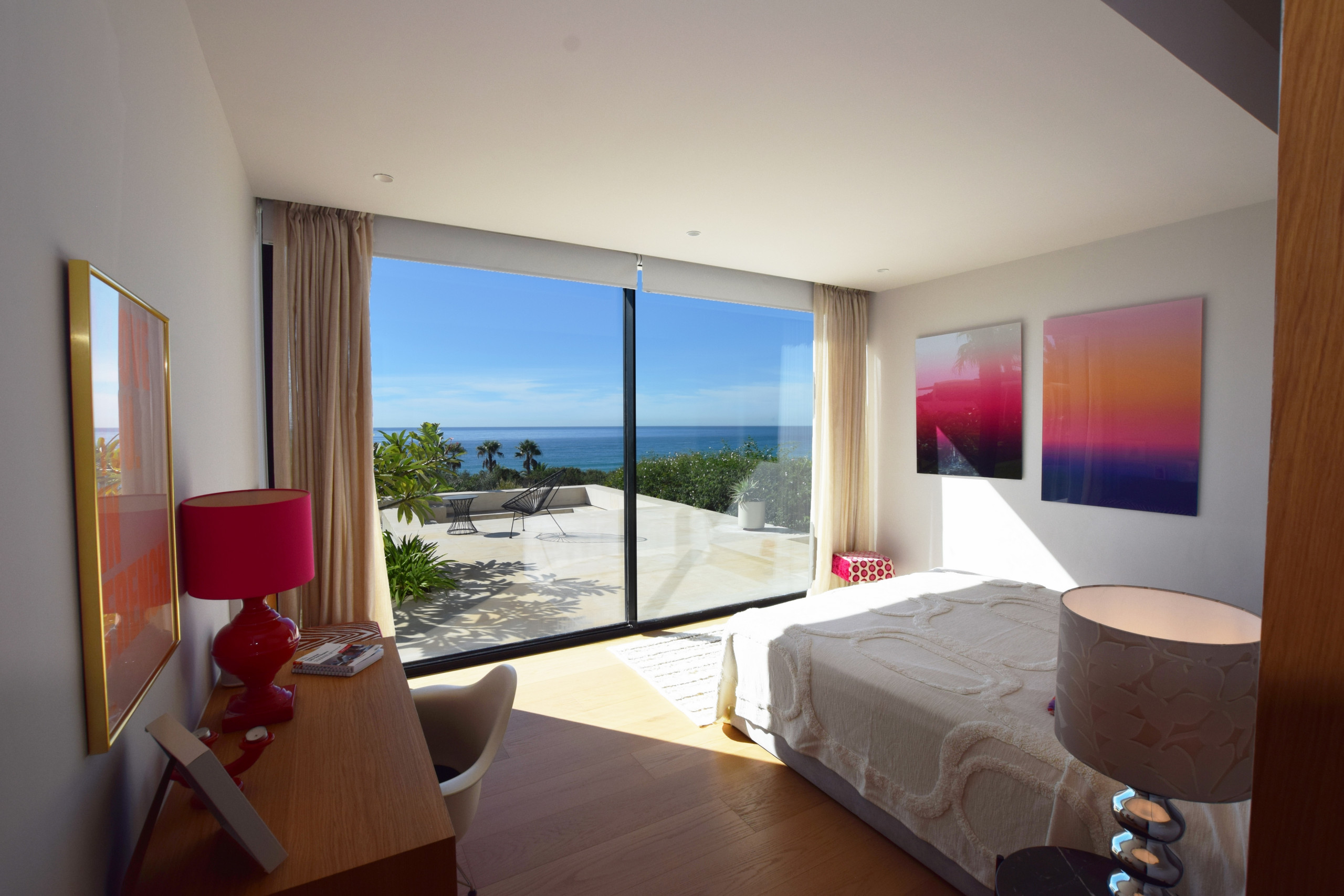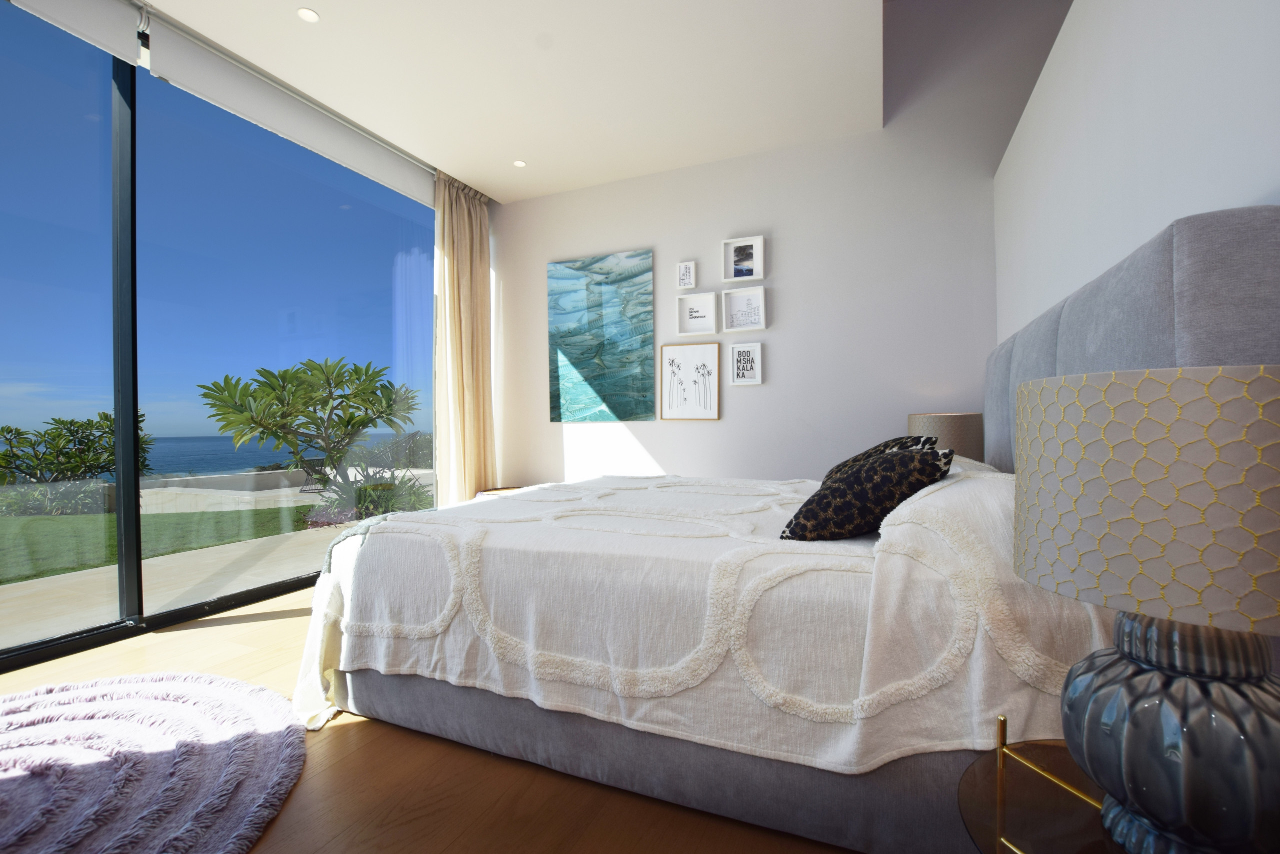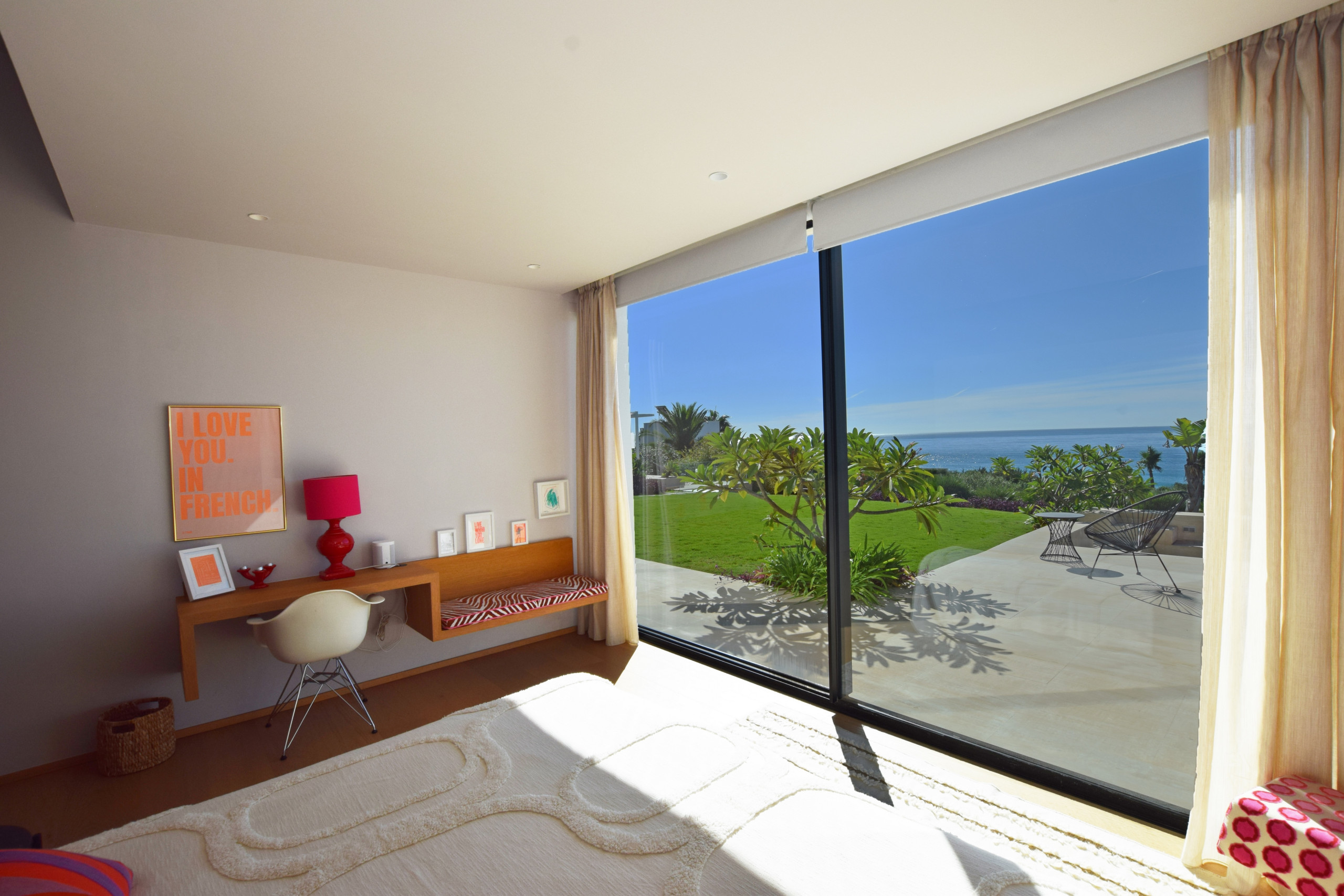 Über eine elegante Treppe gelangen Sie in die untere Etage, die intelligent gestaltet ist, um Privatsphäre und verschiedene Freizeitbereiche zu bieten – alle mit Zugang zum üppigen Garten und Meer.