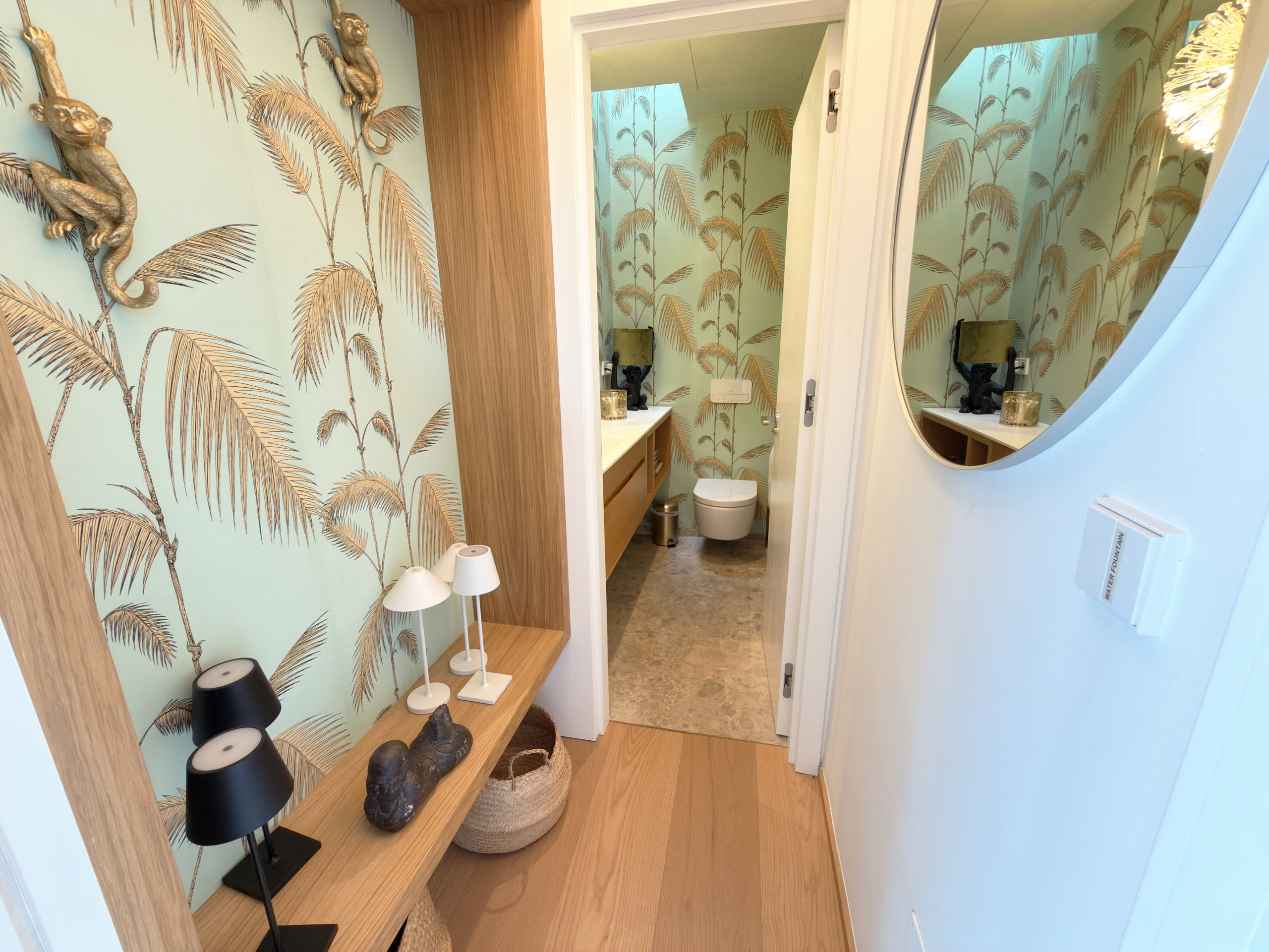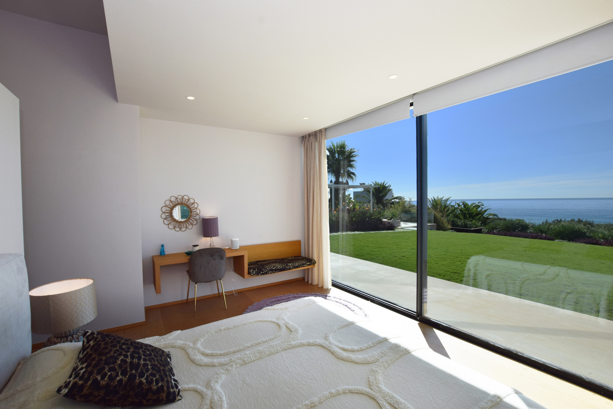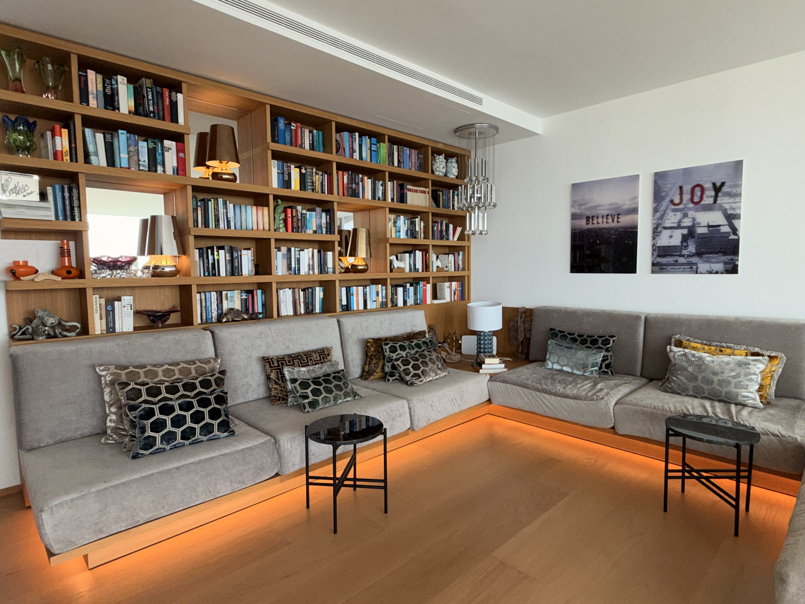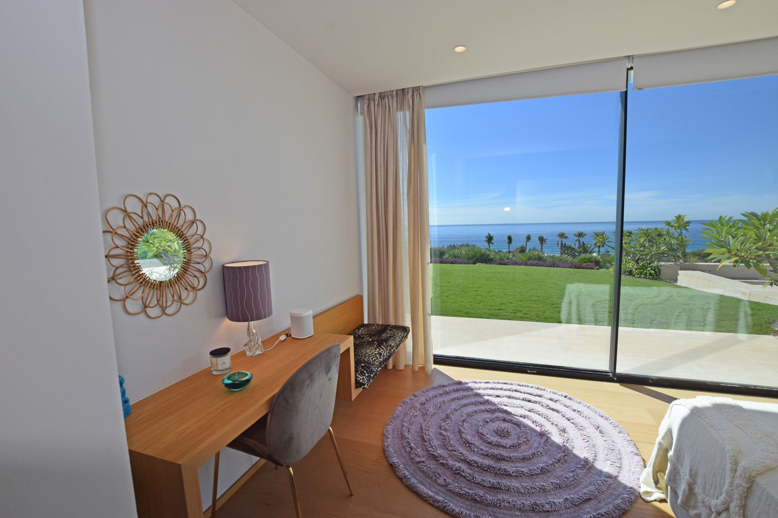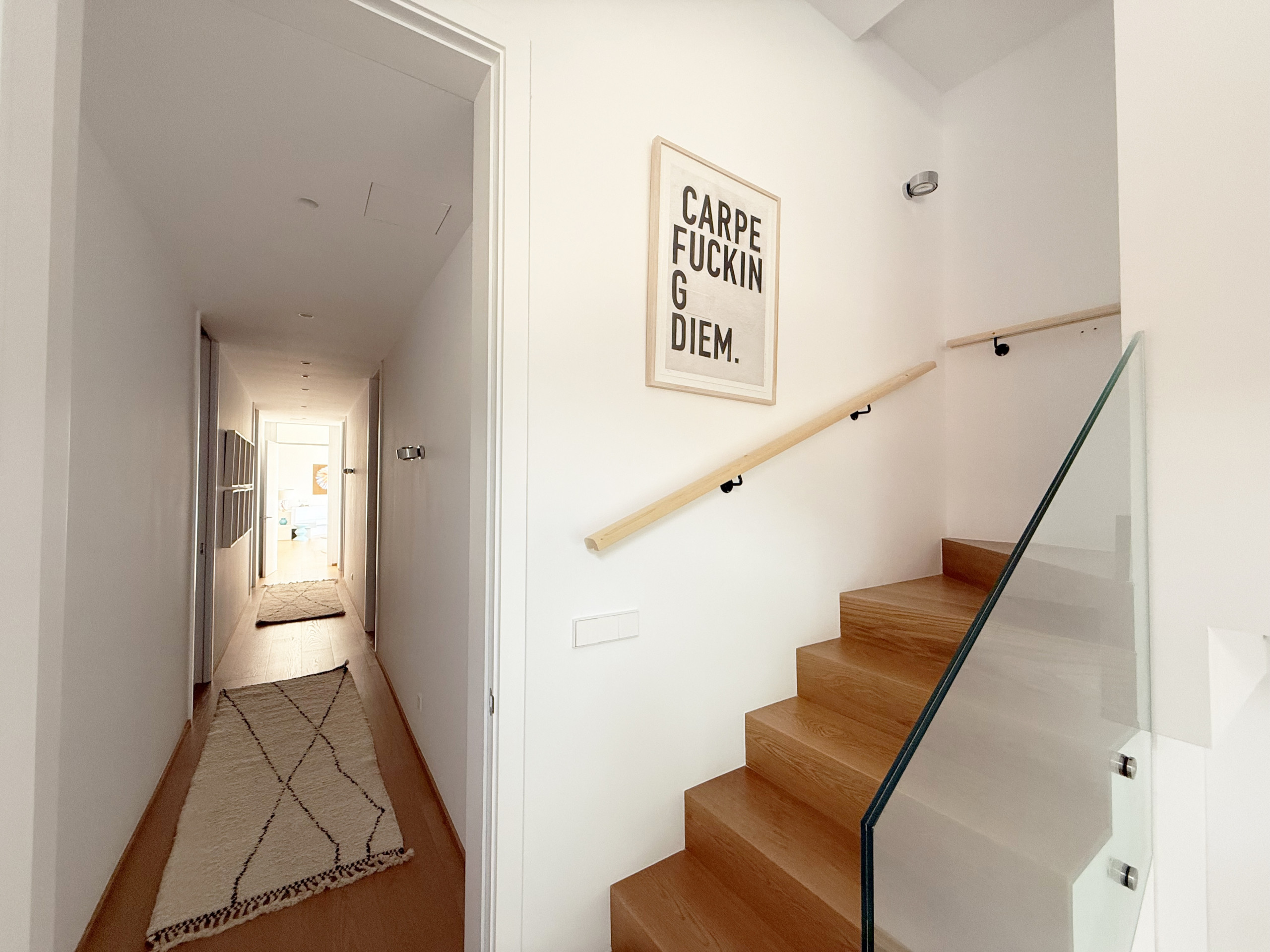 Über eine elegante Treppe gelangen Sie in die untere Etage, die intelligent gestaltet ist, um Privatsphäre und verschiedene Freizeitbereiche zu bieten – alle mit Zugang zum üppigen Garten und Meer.