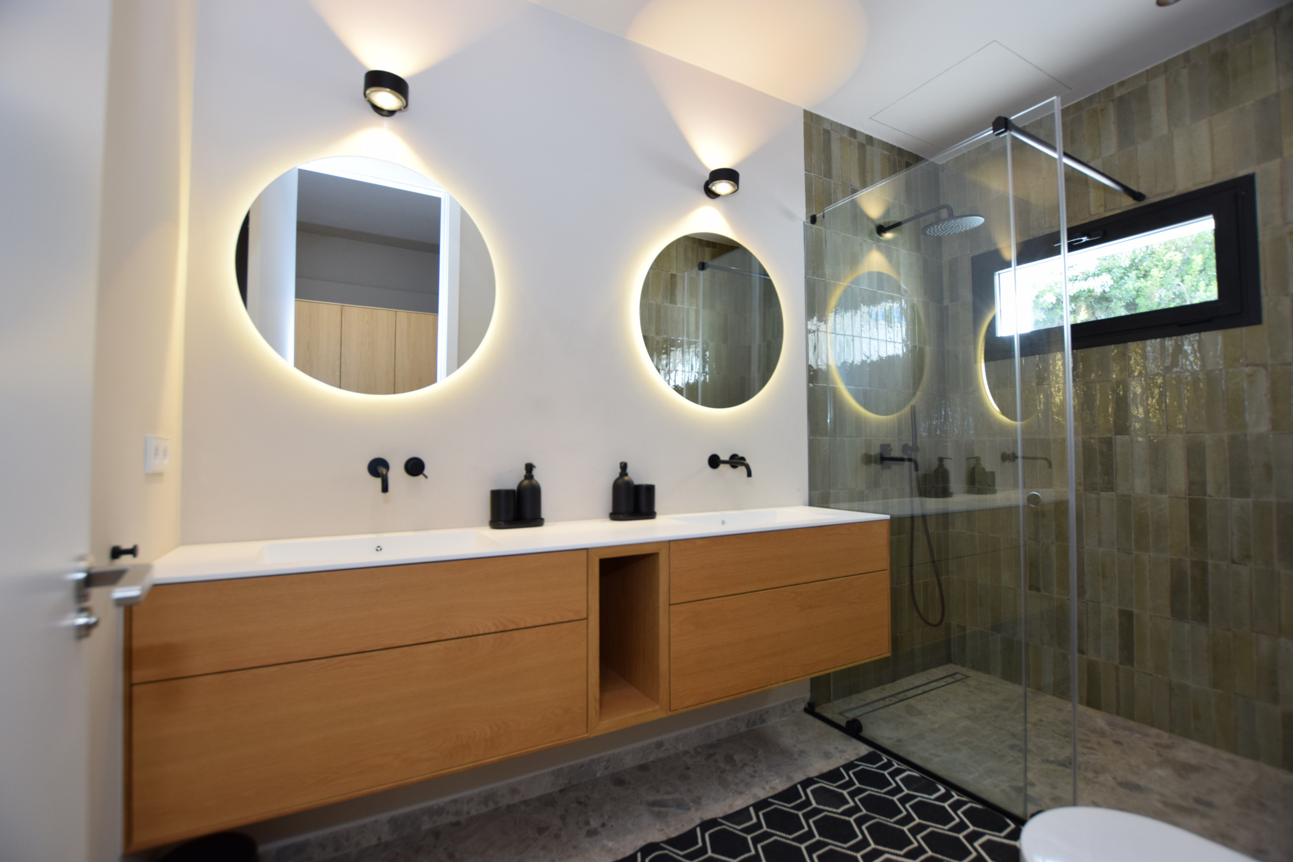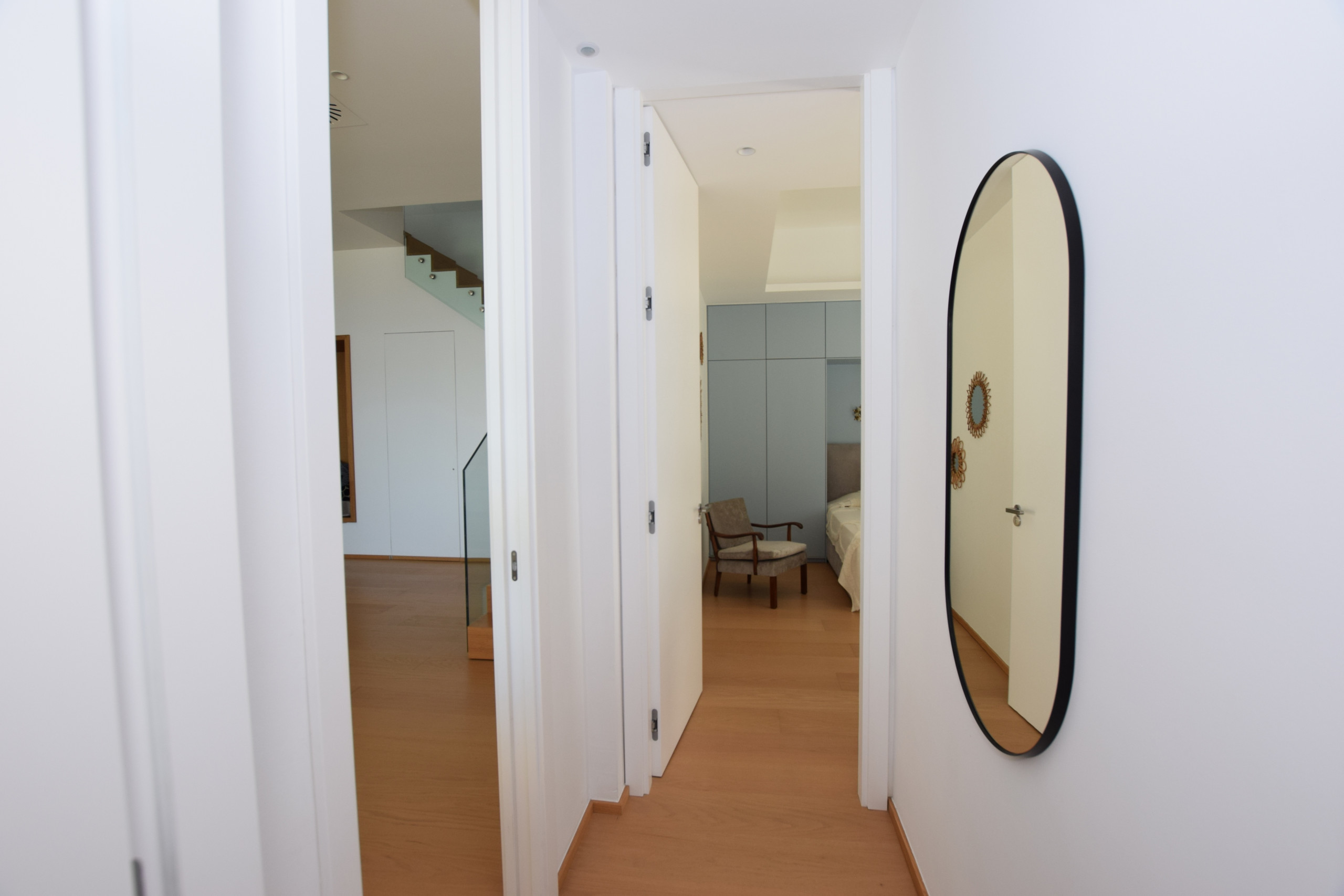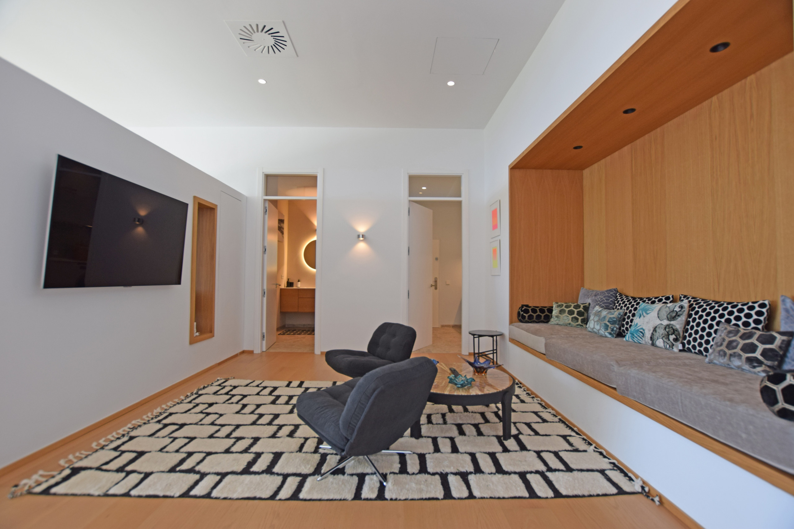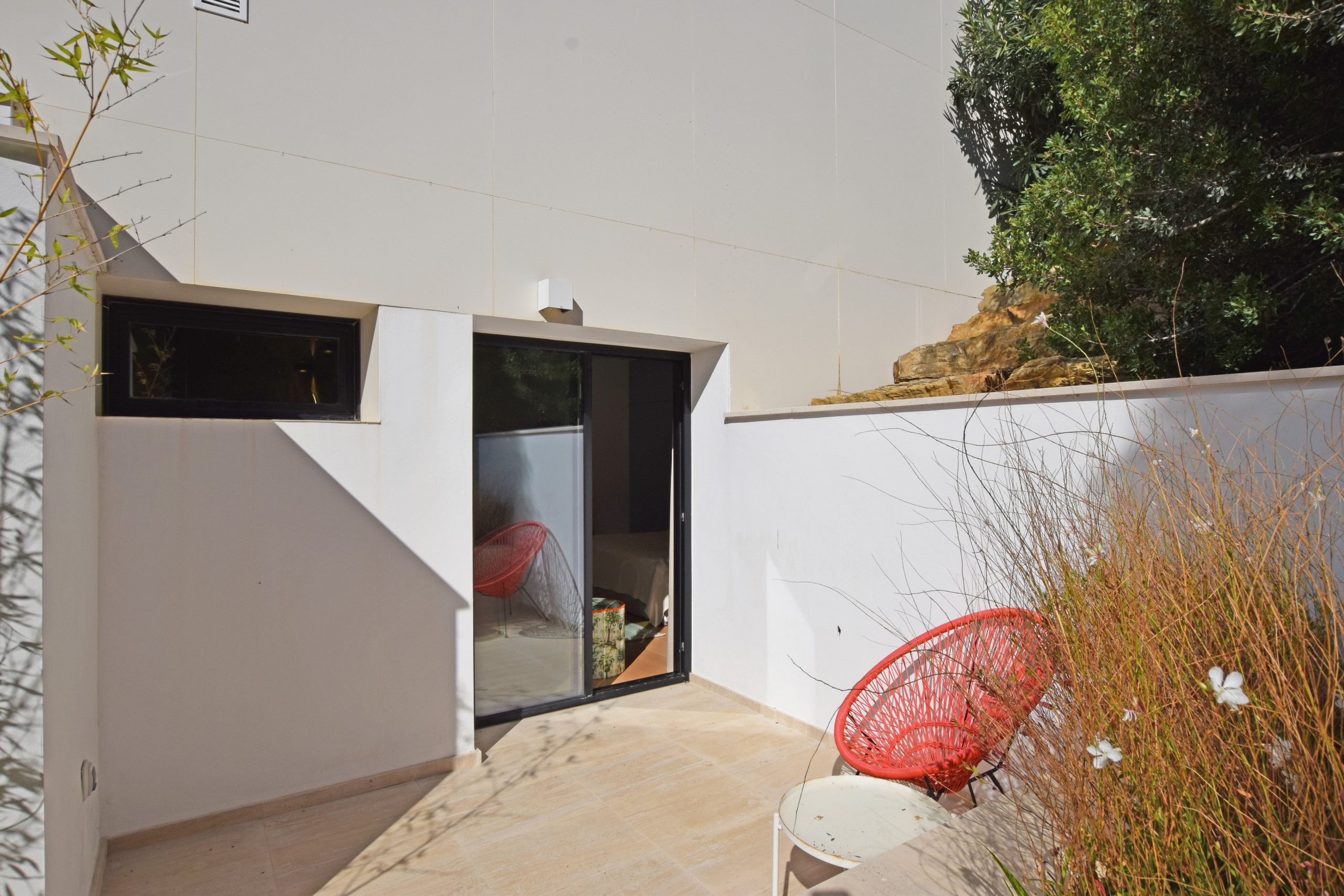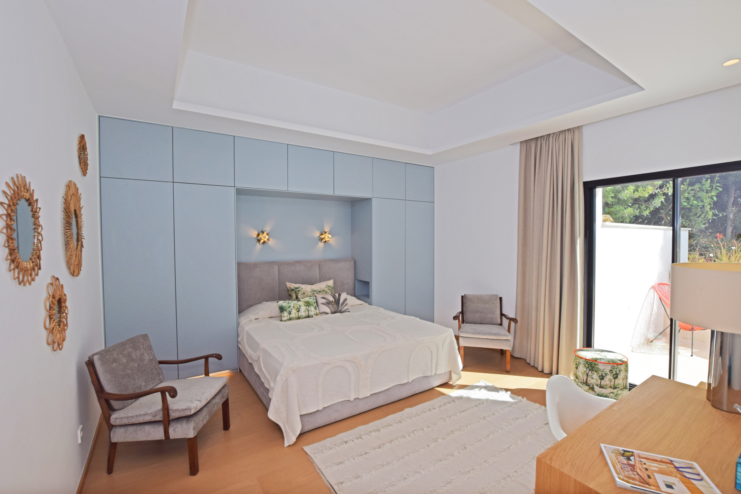 Über eine elegante Treppe gelangen Sie in die untere Etage, die intelligent gestaltet ist, um Privatsphäre und verschiedene Freizeitbereiche zu bieten – alle mit Zugang zum üppigen Garten und Meer.