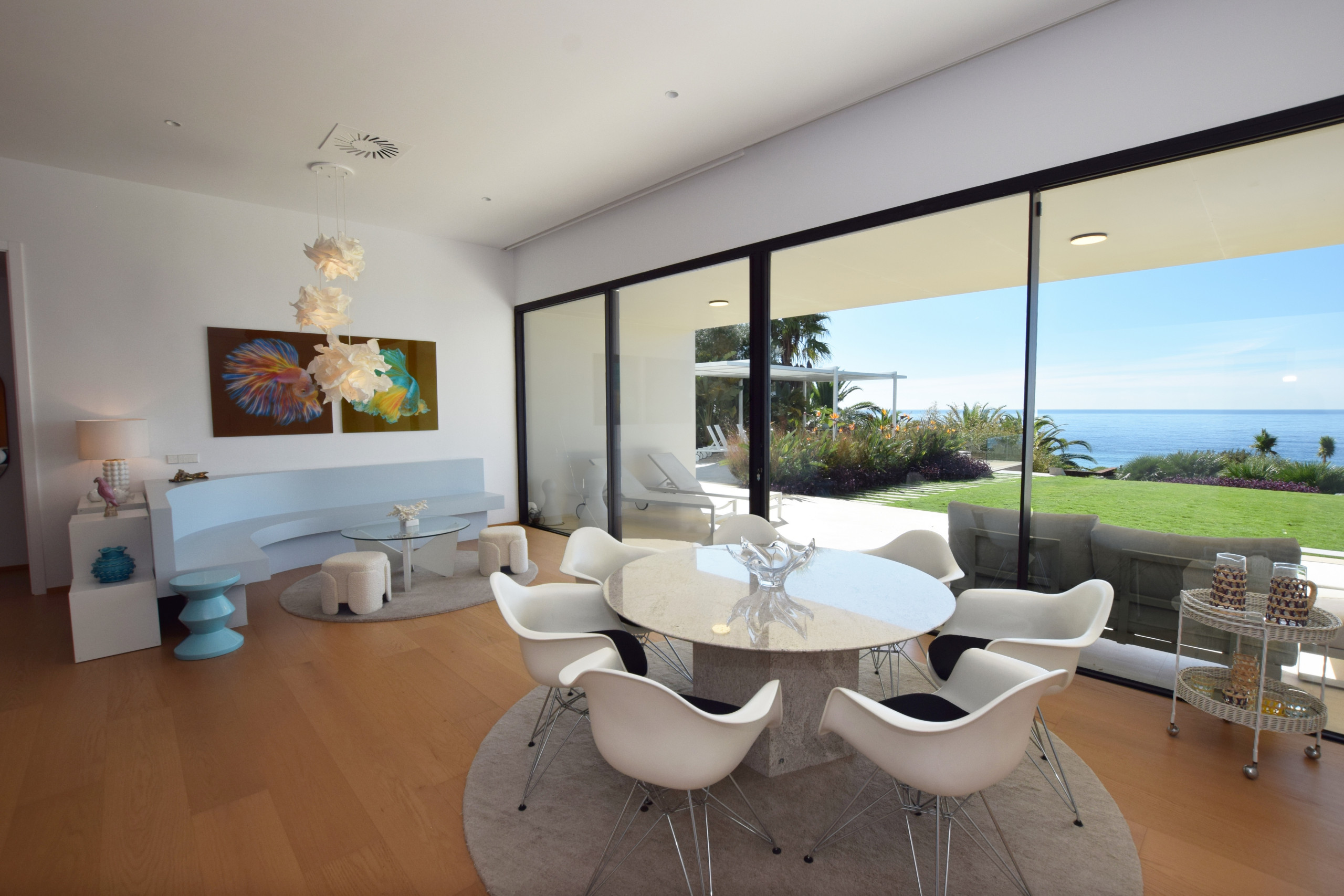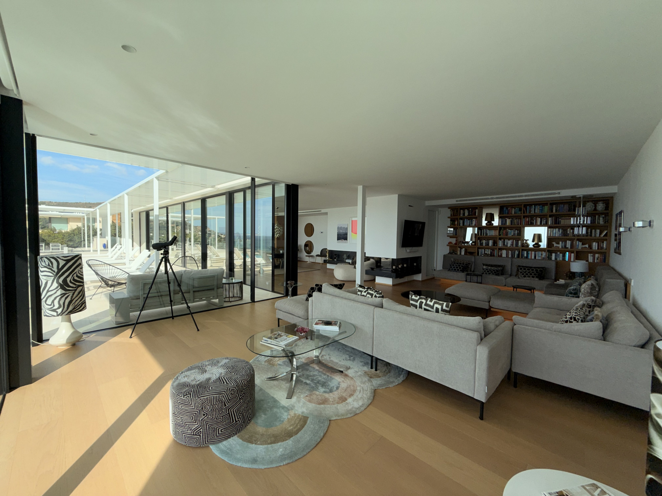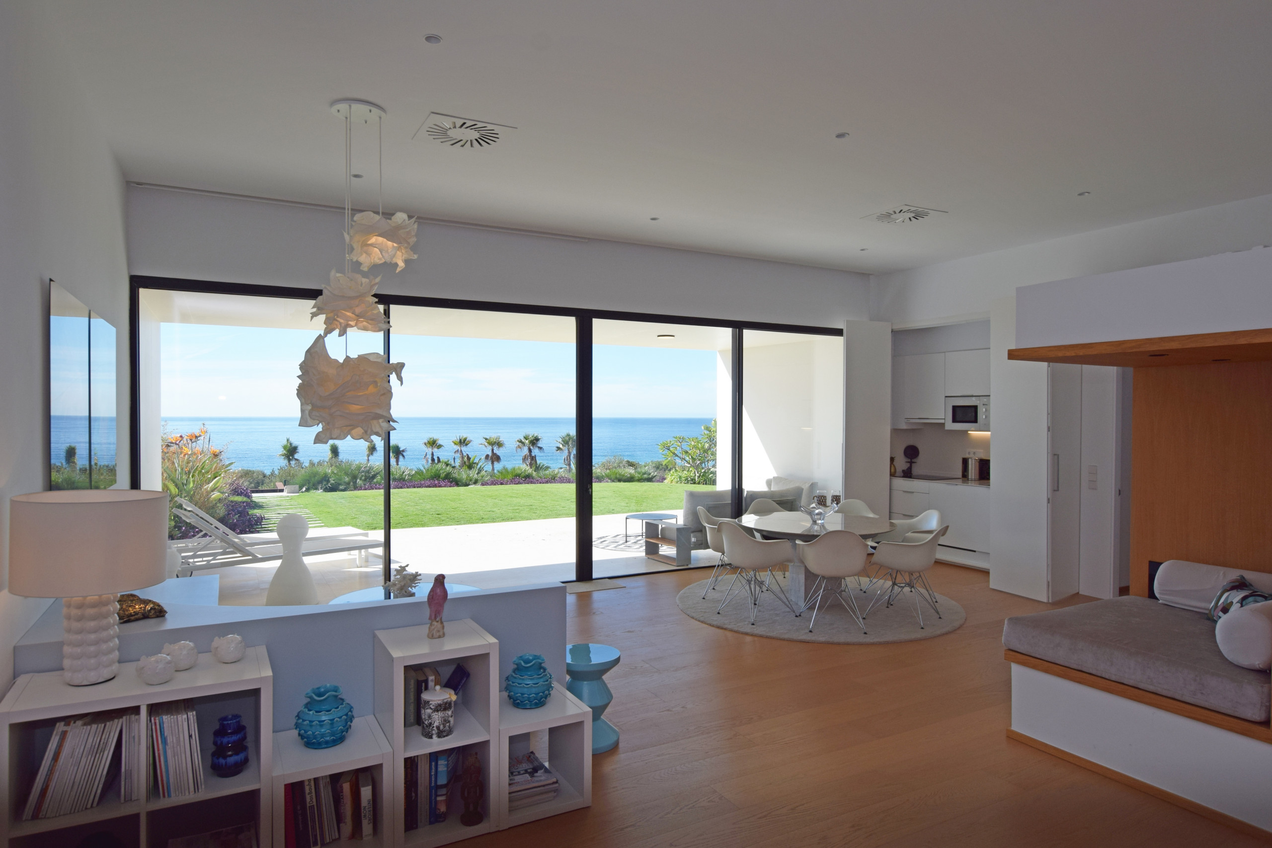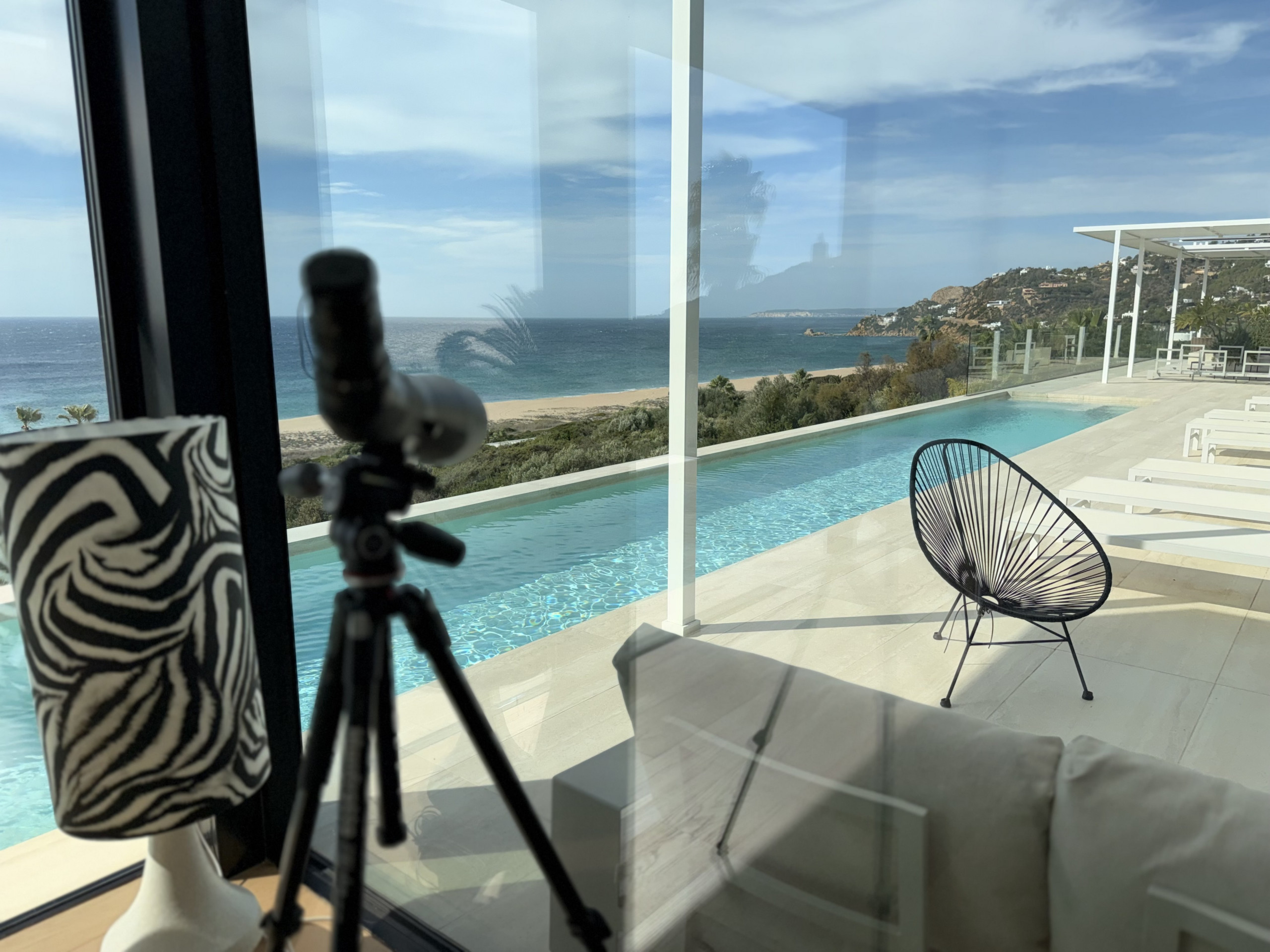 Ess- und Wohnbereich: Ein großzügiger Raum zum Verweilen – Esszimmer und Wohnzimmer mit Bibliothek sind vollständig zum Meer hin ausgerichtet und schaffen eine Atmosphäre der Ruhe und des Luxus. Mit dem bereitstehenden Teleskop können Sie – mit etwas Glück – Wale, Delfine und zahlreiche Vogelarten beobachten, die in der Meerenge von Gibraltar und ihrem Naturpark leben.