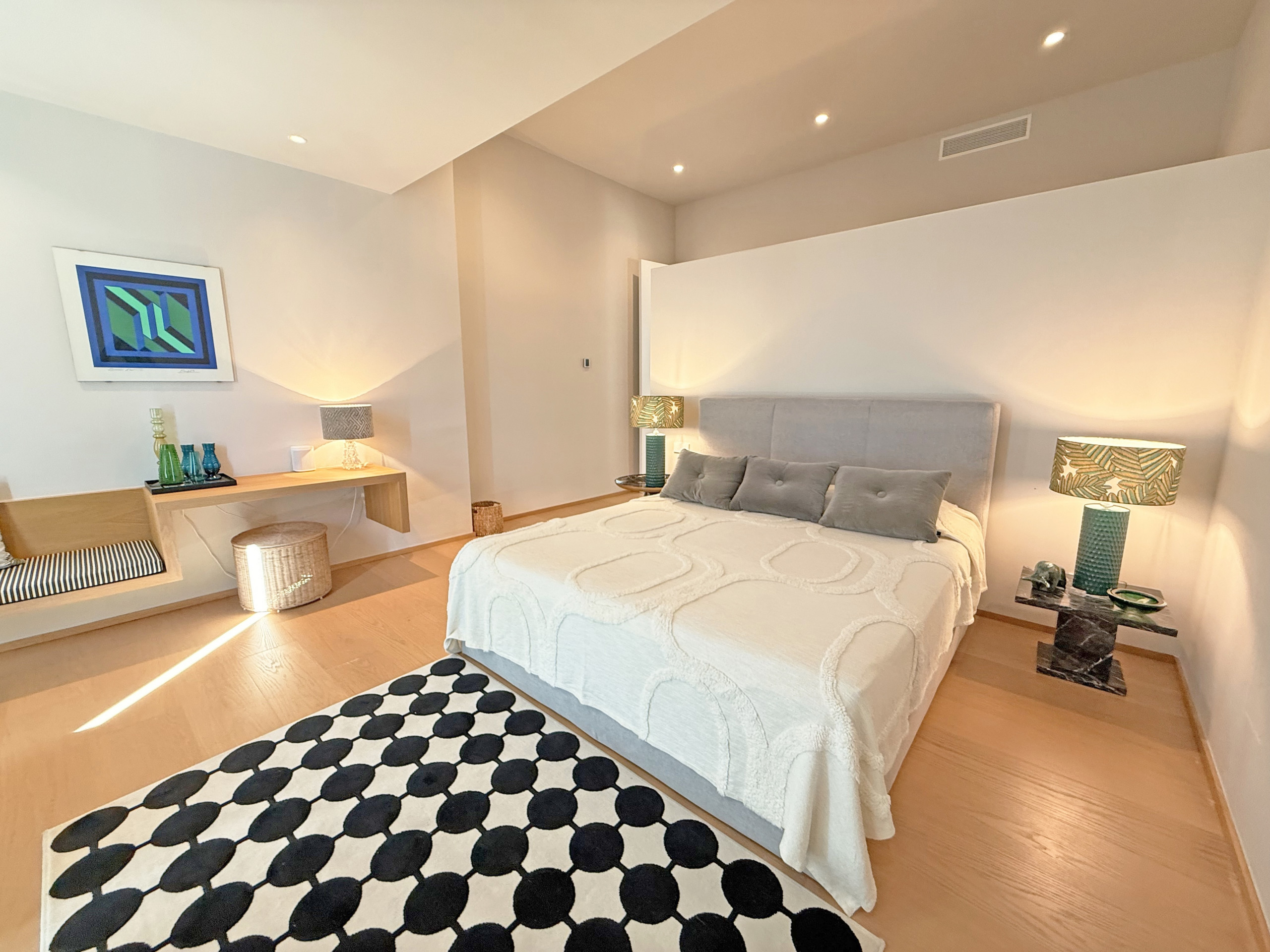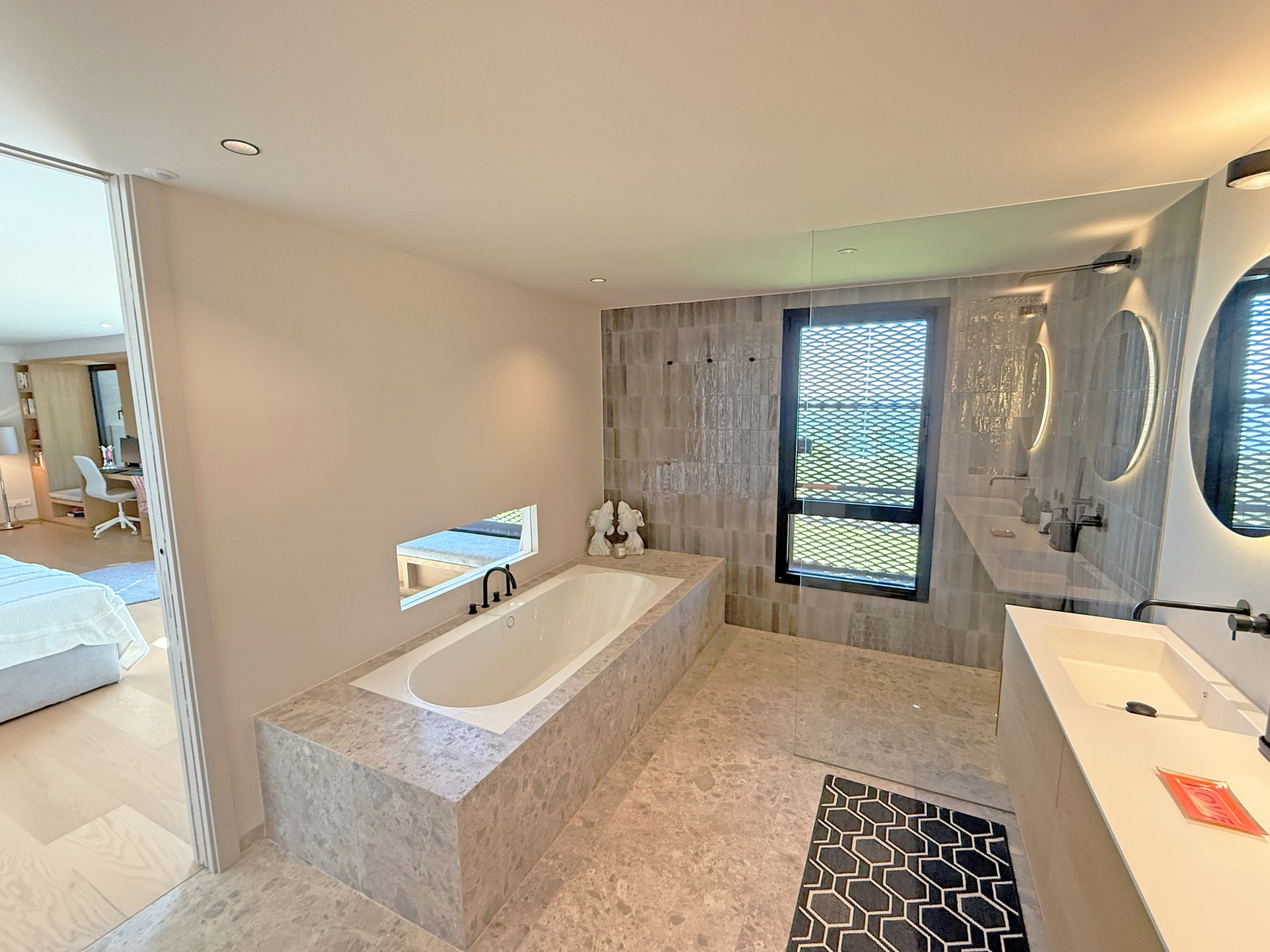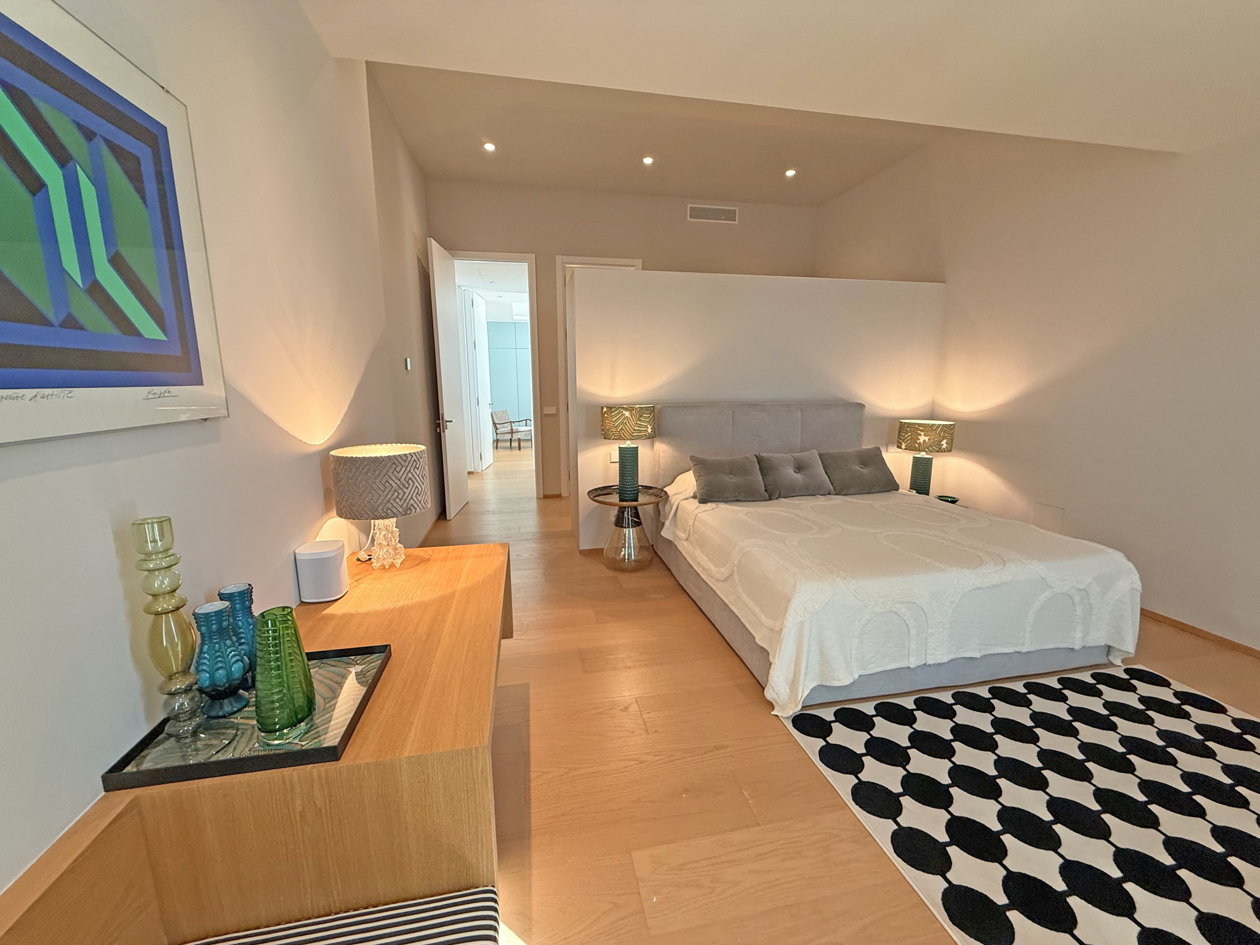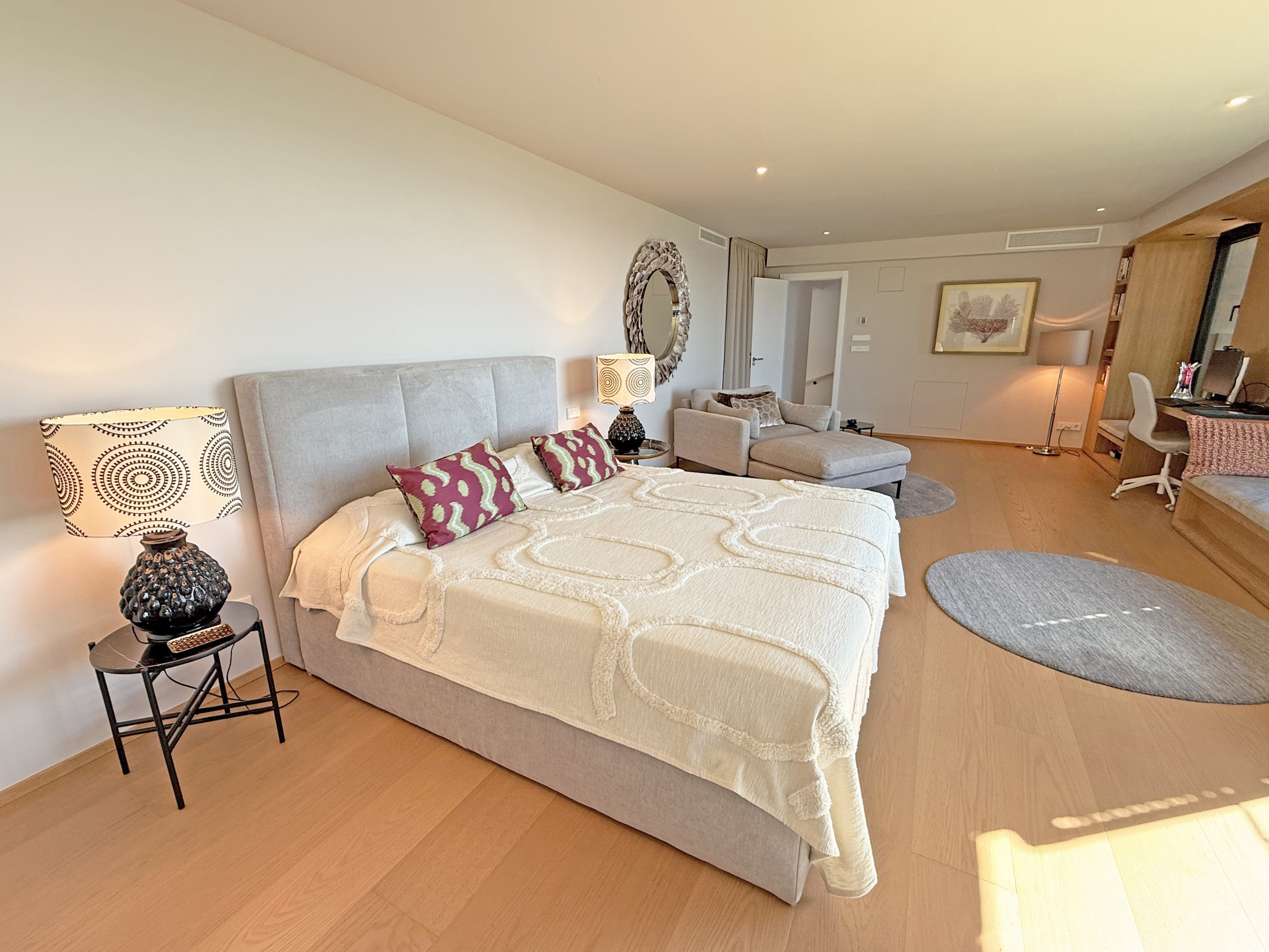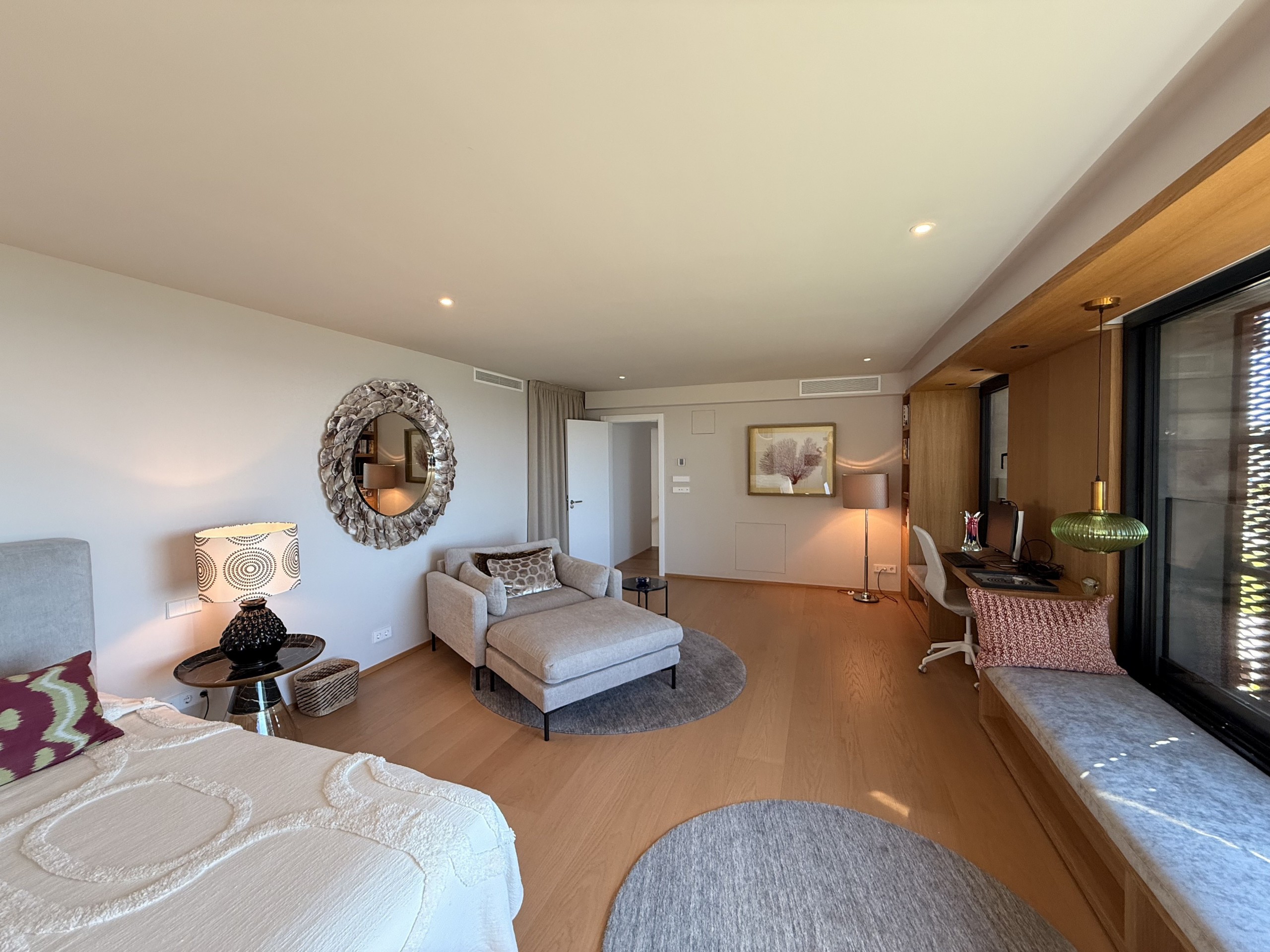 Neben dem Fitnessraum, über eine kleine Treppe erreichbar, liegt das Hauptschlafzimmer – ein privater Rückzugsort für maximale Erholung, ausgestattet mit Arbeitsbereich, Bad mit Dusche und Badewanne, Ankleideraum und WC-Bereich.