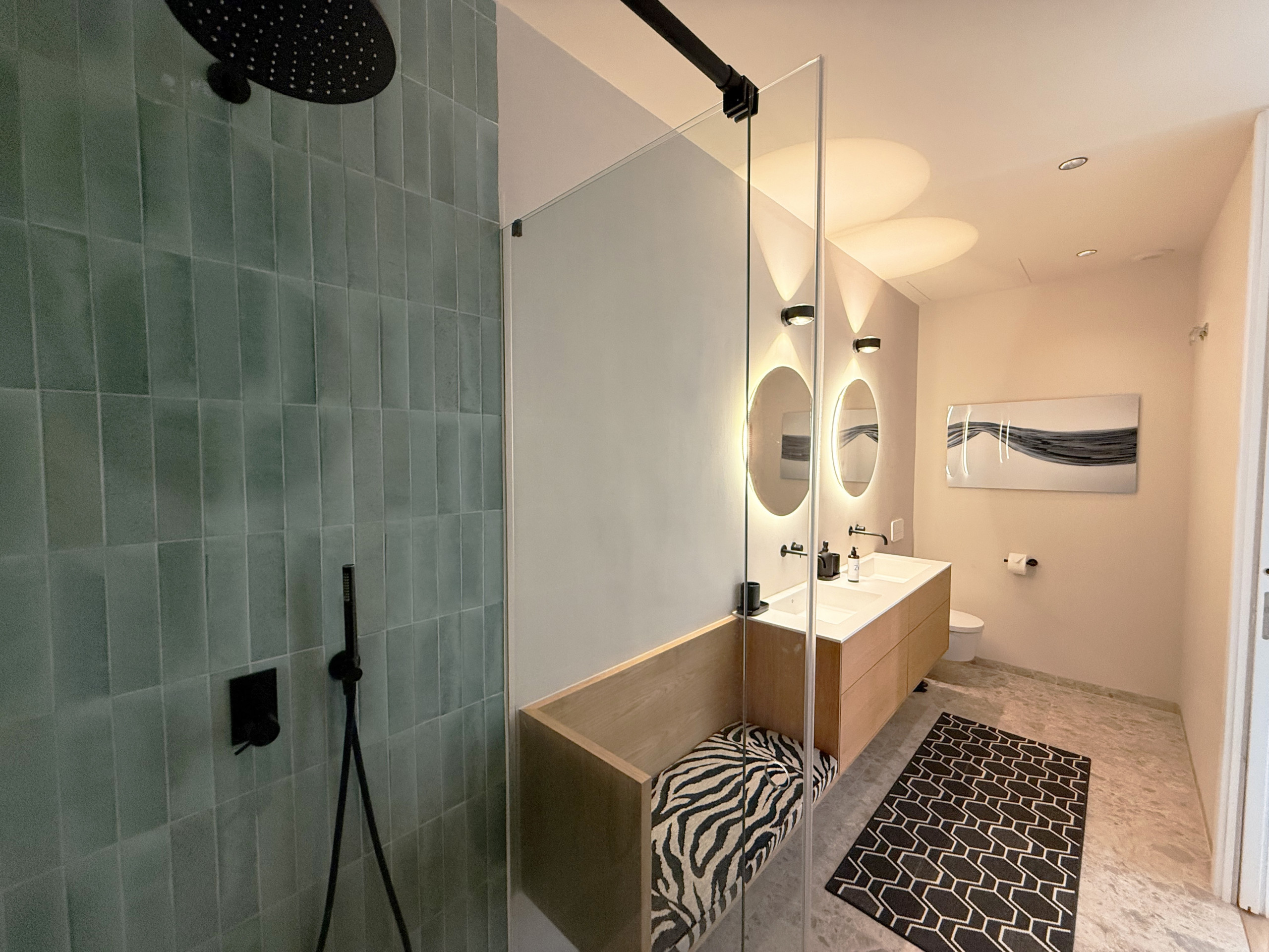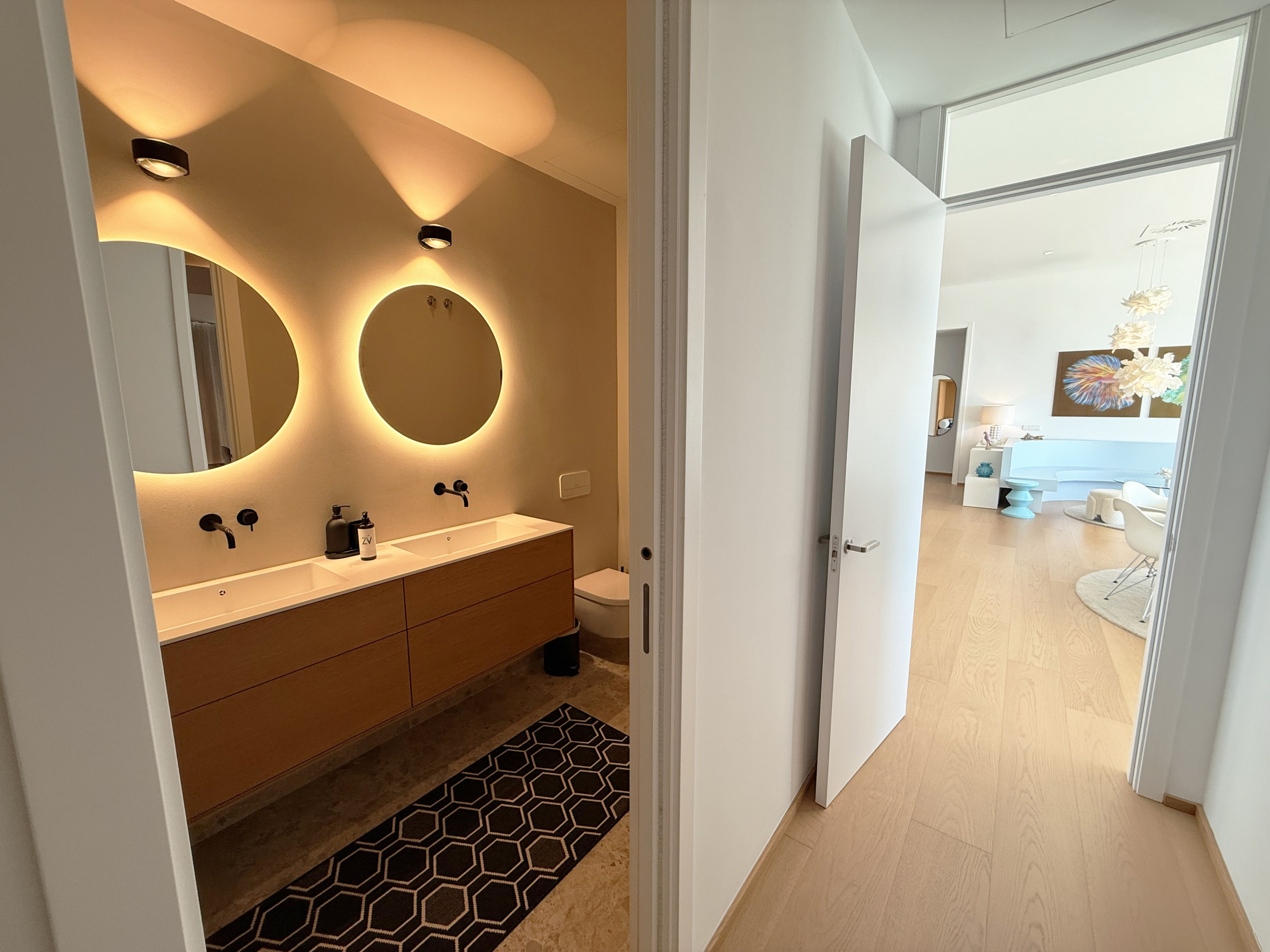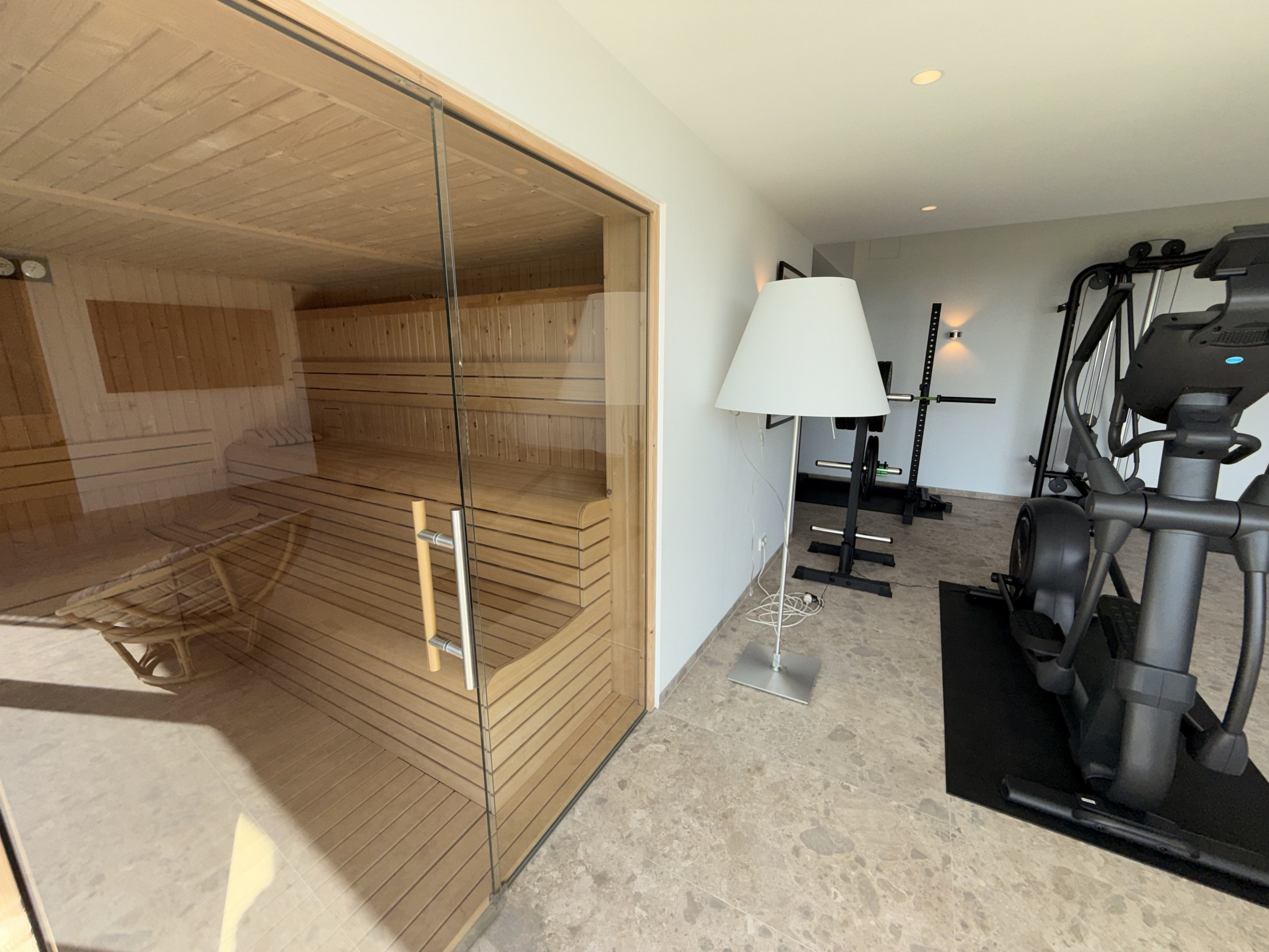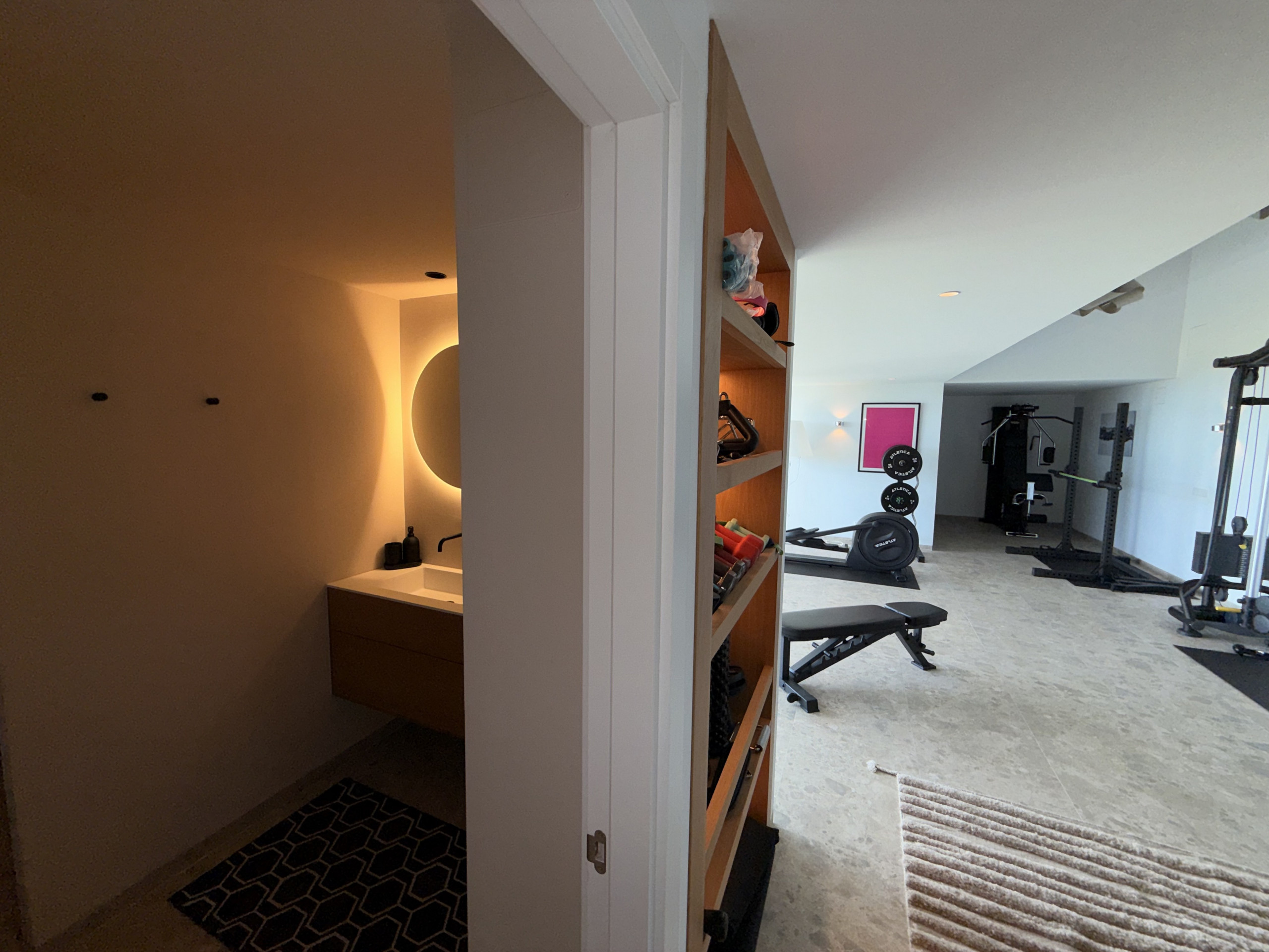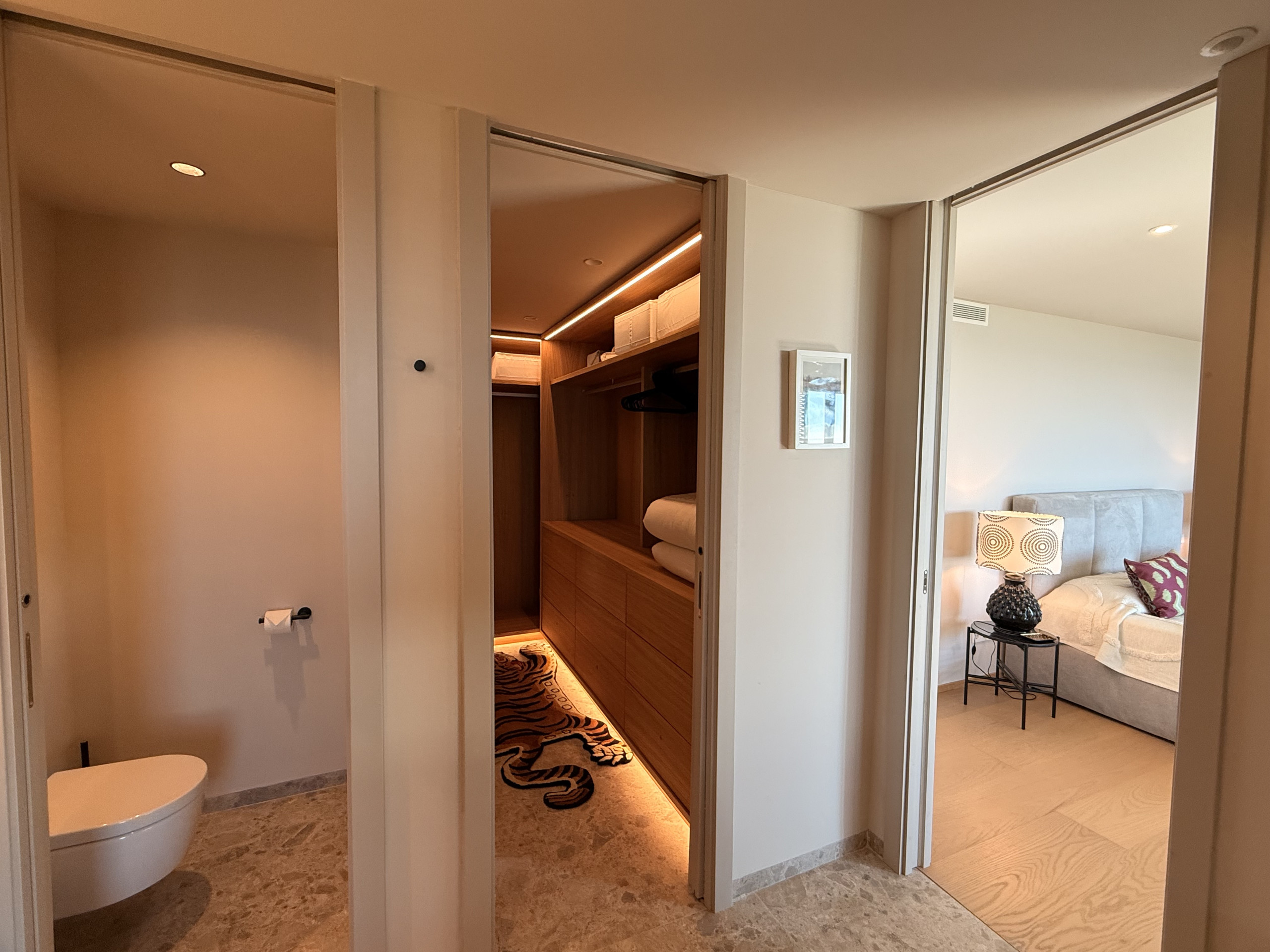 Neben dem Fitnessraum, über eine kleine Treppe erreichbar, liegt das Hauptschlafzimmer – ein privater Rückzugsort für maximale Erholung, ausgestattet mit Arbeitsbereich, Bad mit Dusche und Badewanne, Ankleideraum und WC-Bereich.