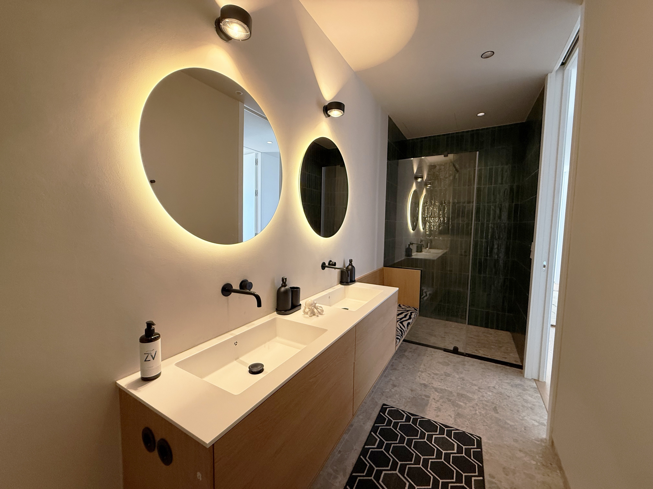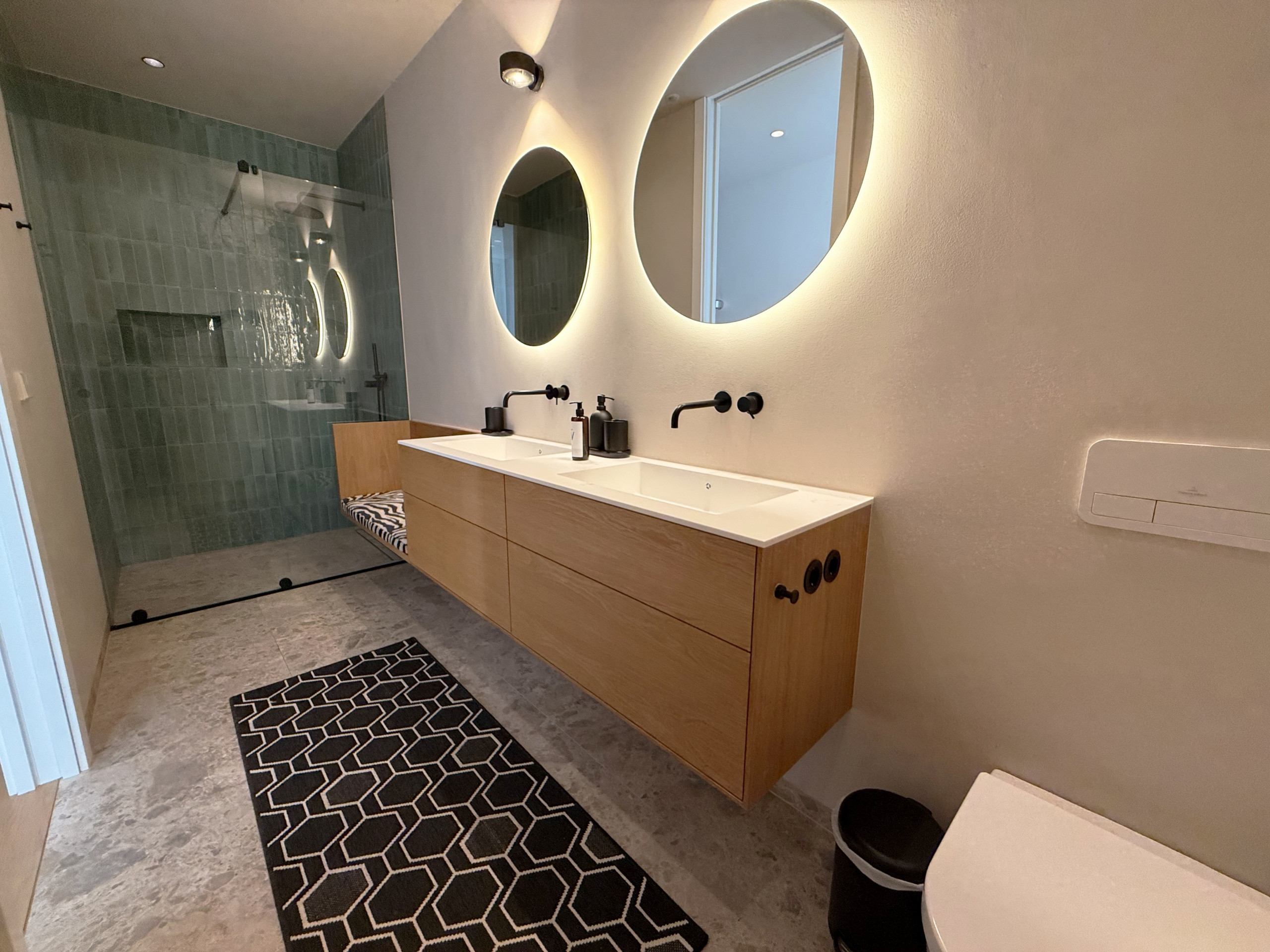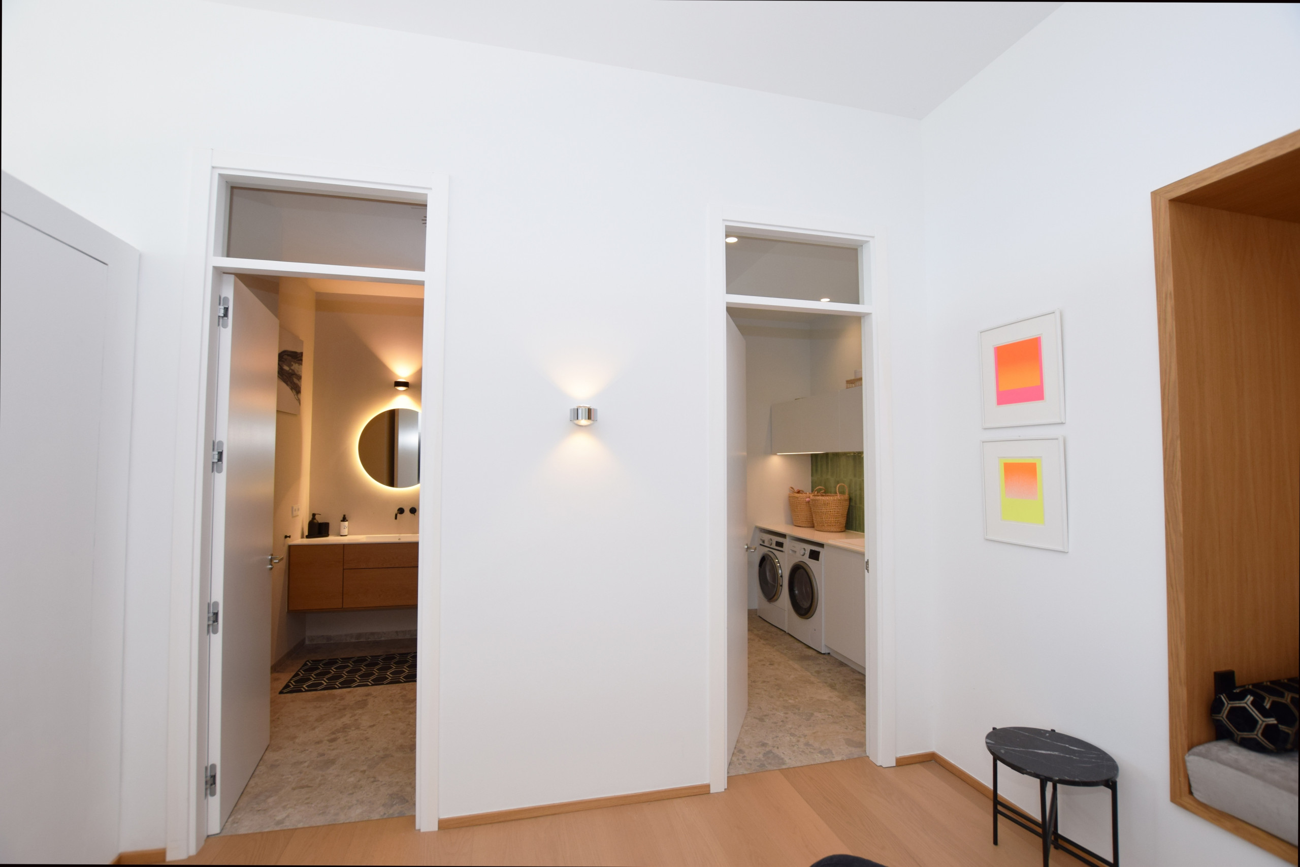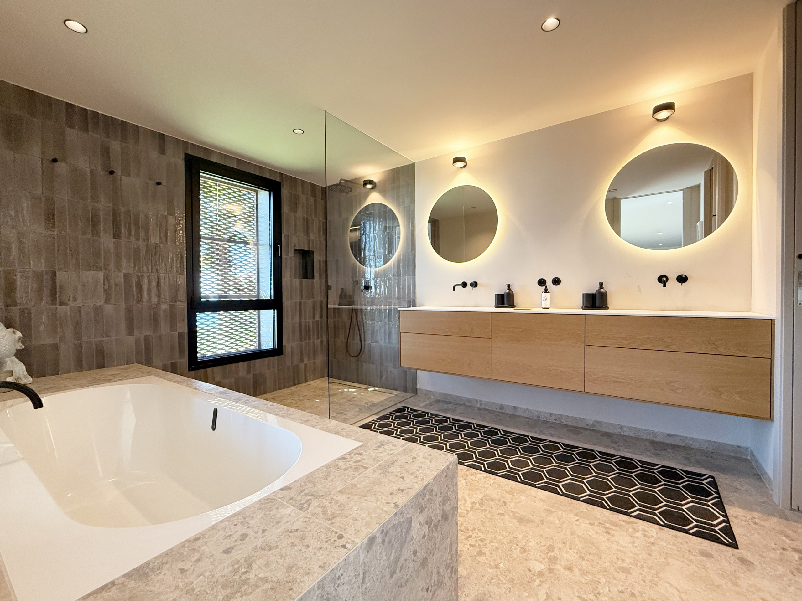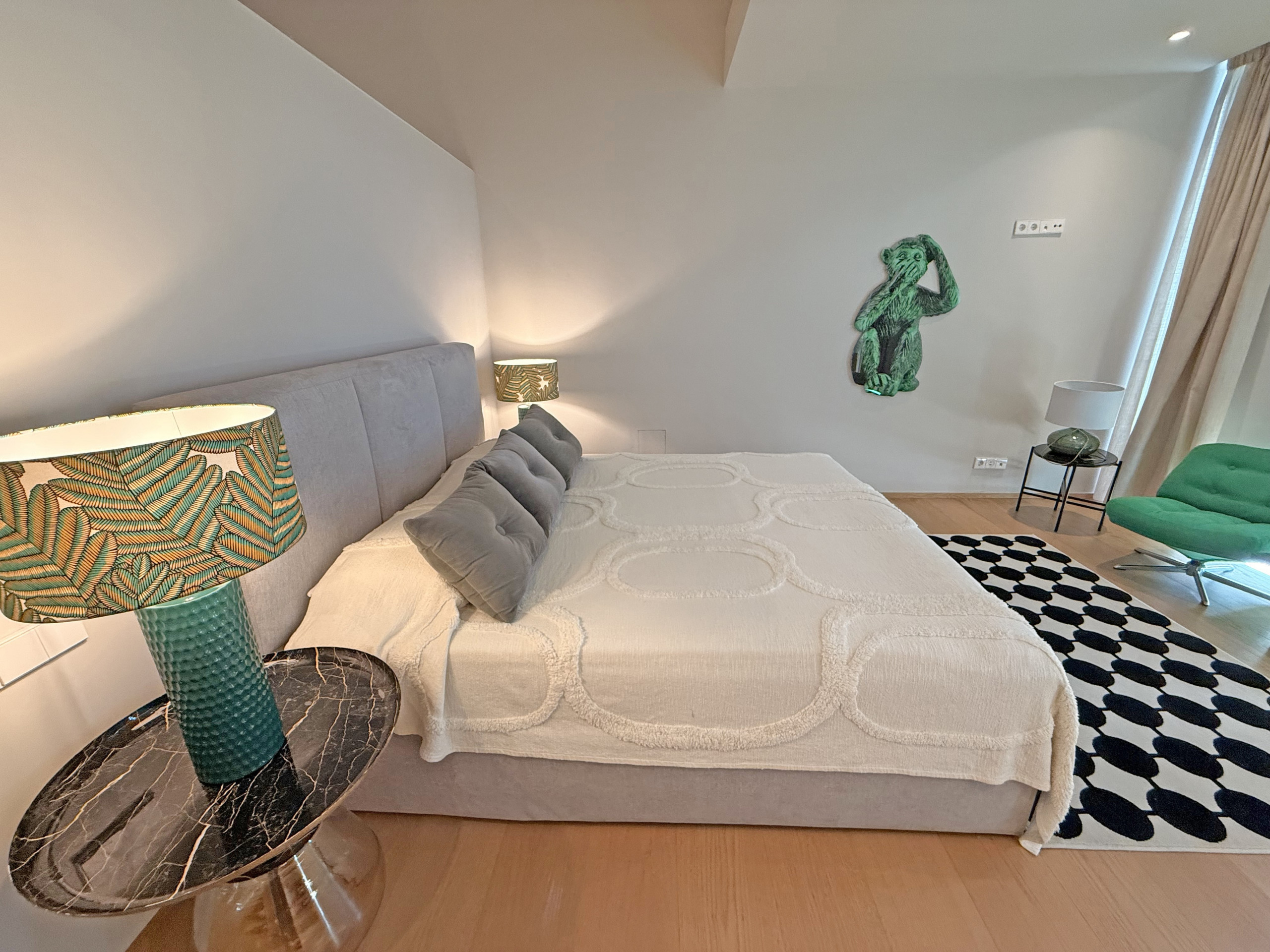 Neben dem Fitnessraum, über eine kleine Treppe erreichbar, liegt das Hauptschlafzimmer – ein privater Rückzugsort für maximale Erholung, ausgestattet mit Arbeitsbereich, Bad mit Dusche und Badewanne, Ankleideraum und WC-Bereich.