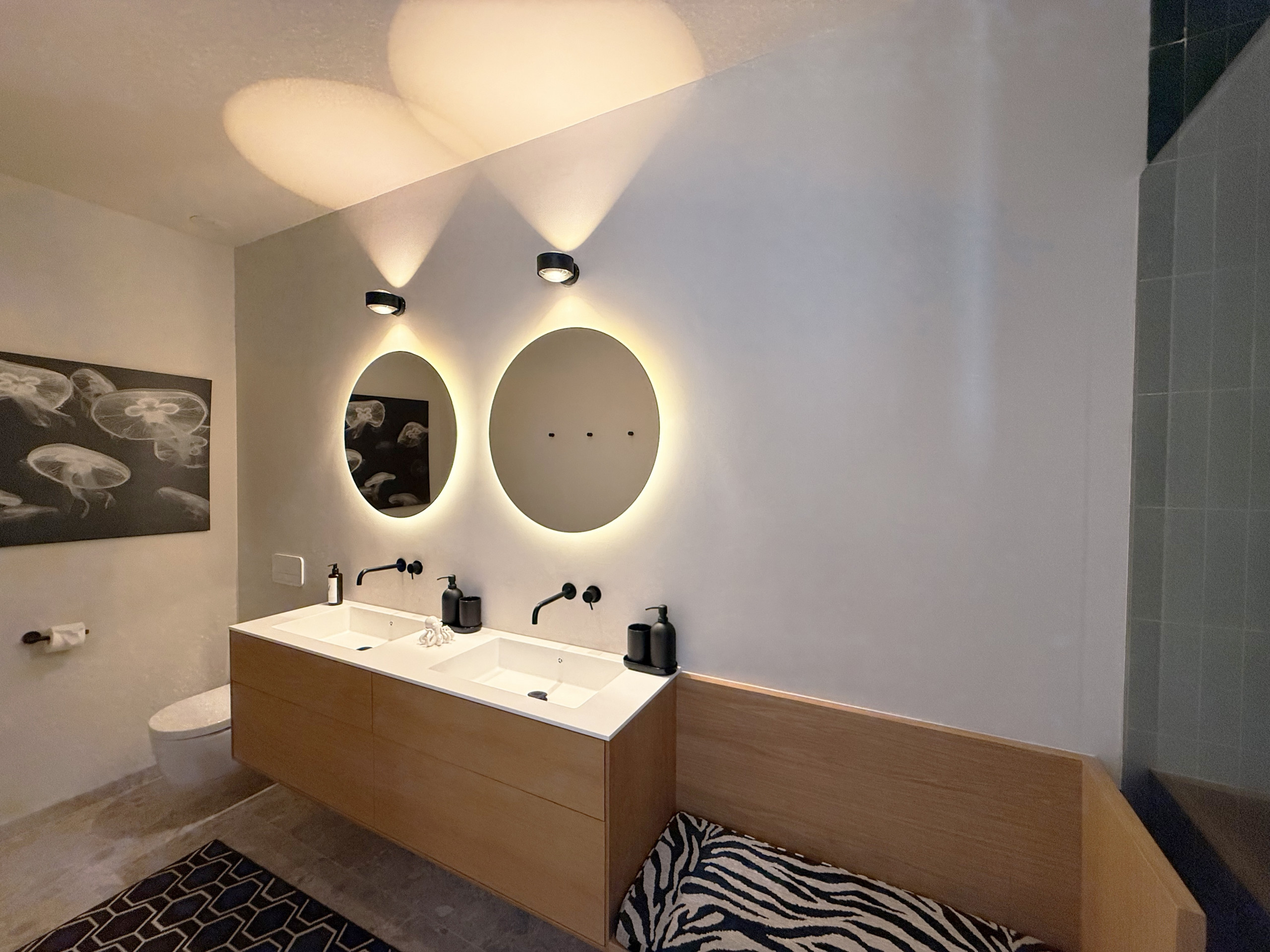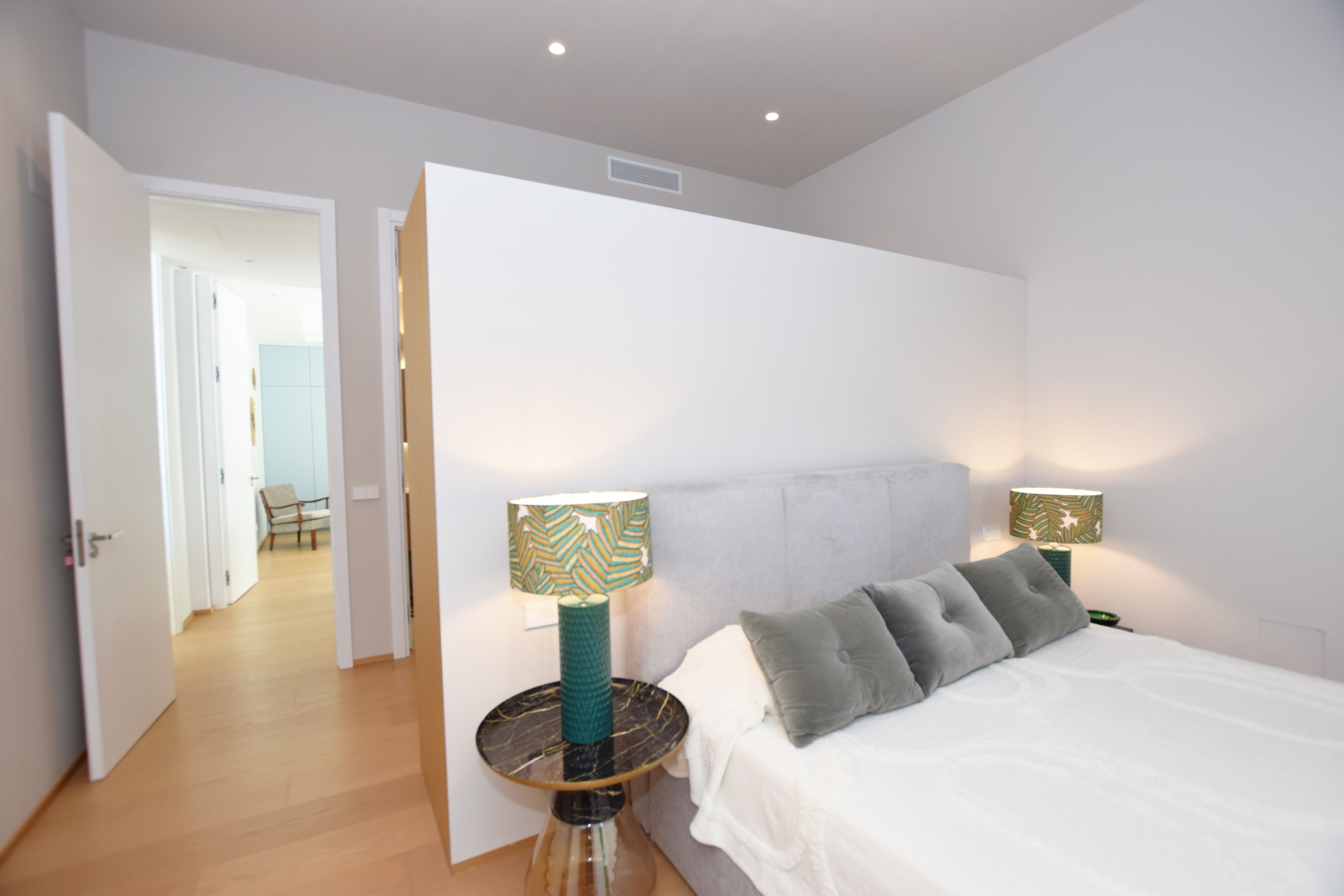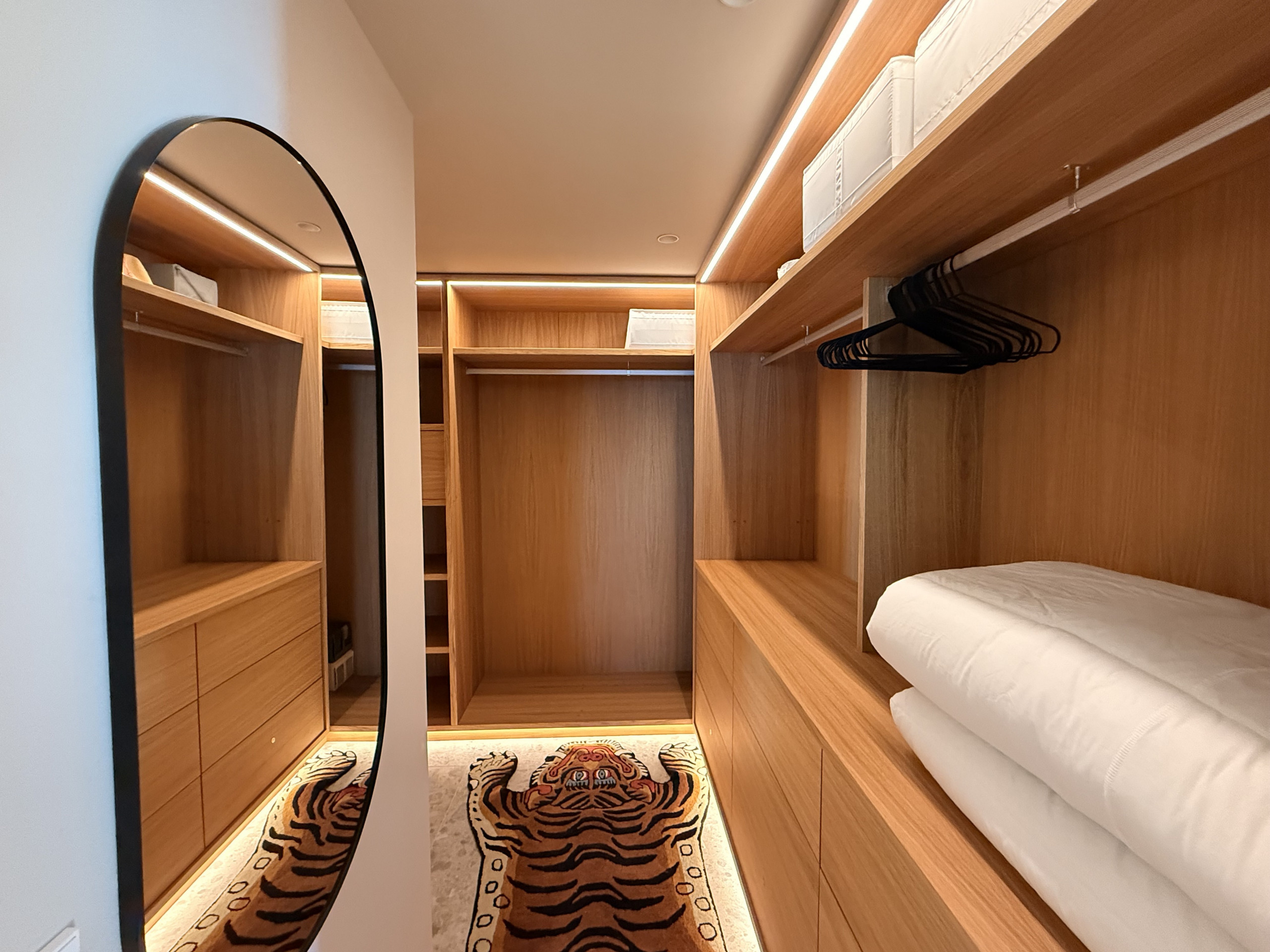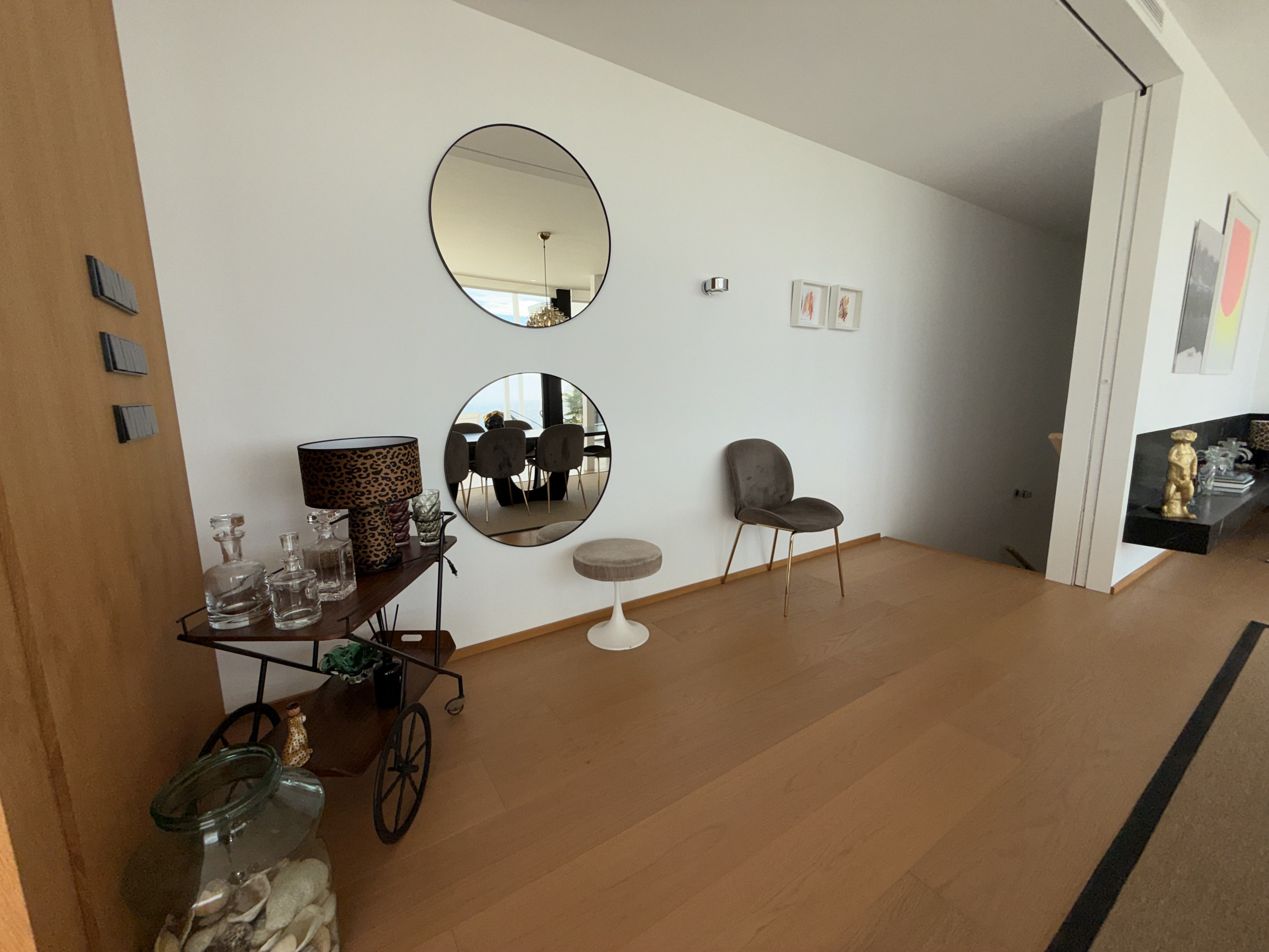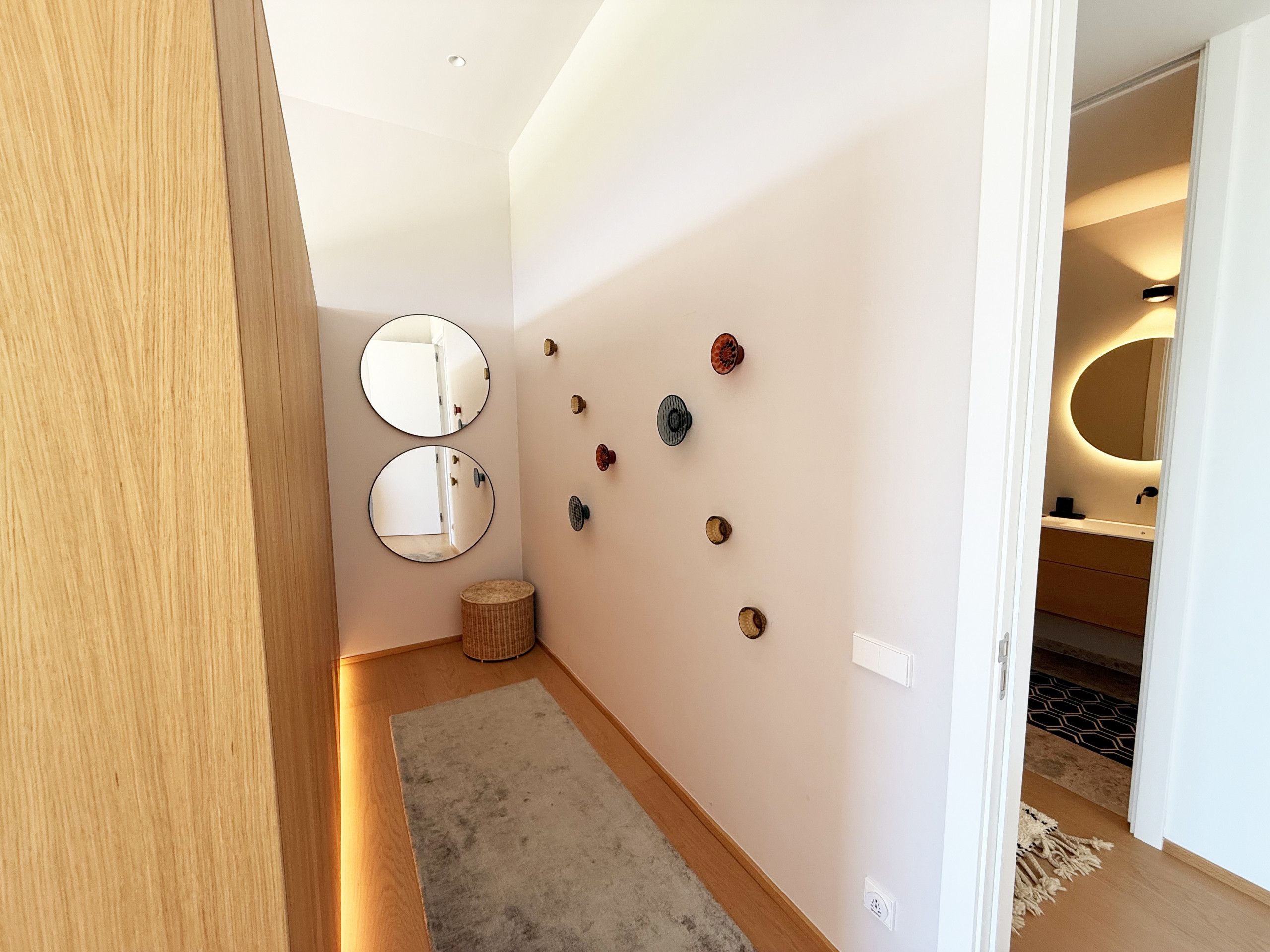 Neben dem Fitnessraum, über eine kleine Treppe erreichbar, liegt das Hauptschlafzimmer – ein privater Rückzugsort für maximale Erholung, ausgestattet mit Arbeitsbereich, Bad mit Dusche und Badewanne, Ankleideraum und WC-Bereich.