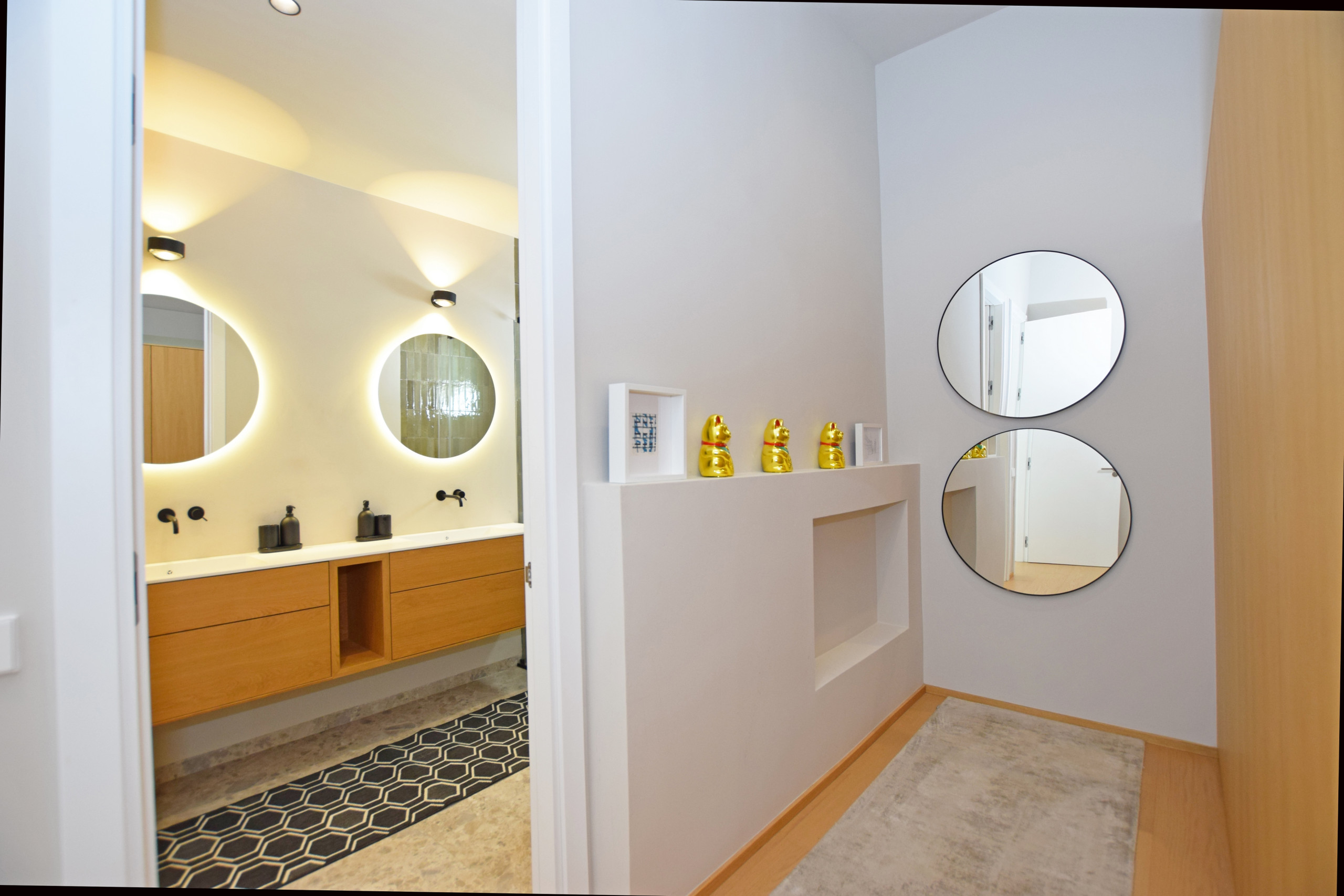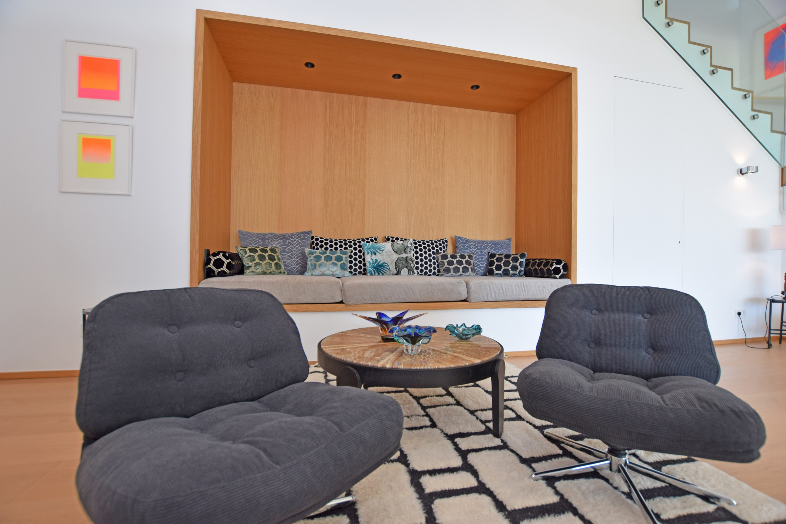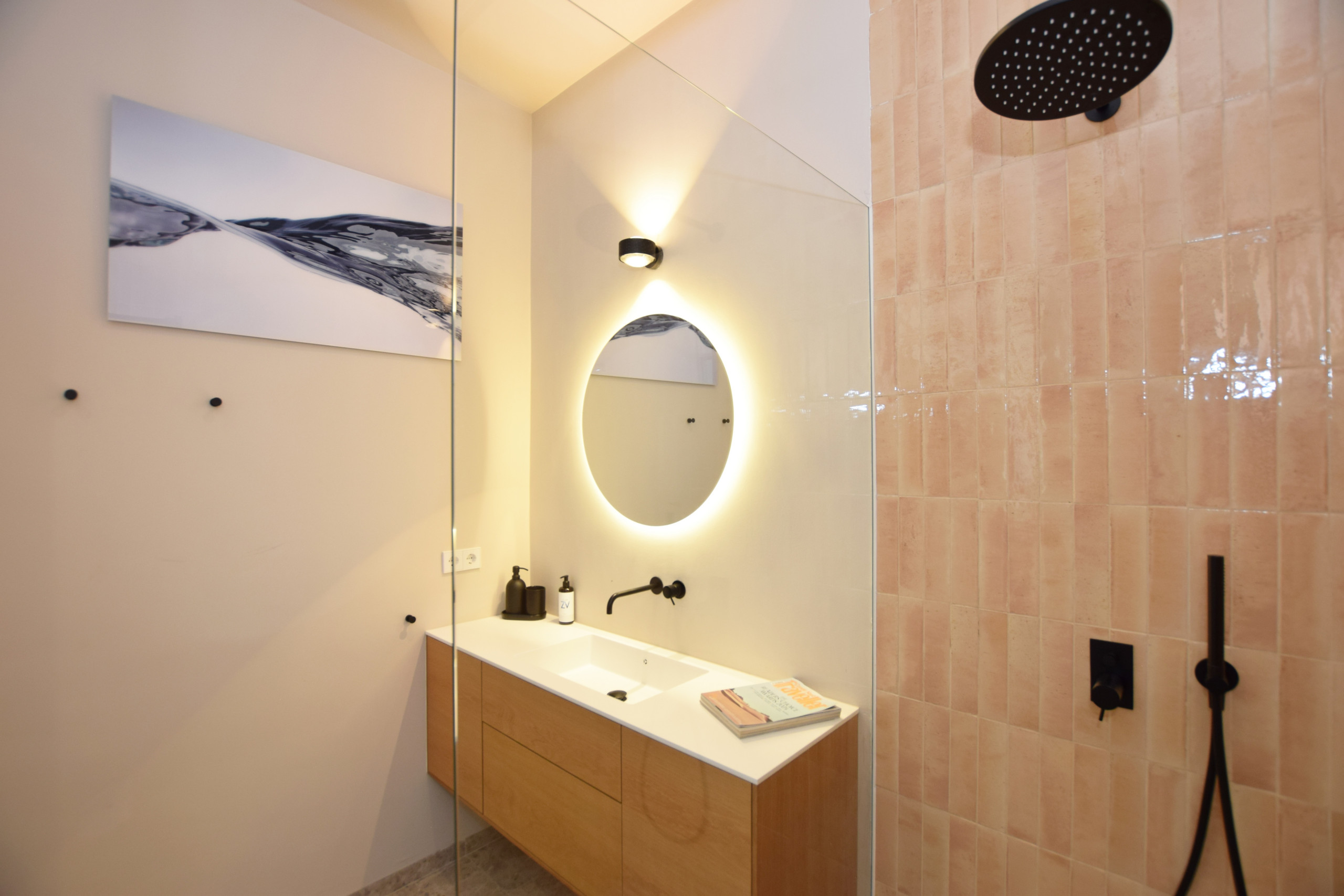 Ein komfortabler Bereich für Unterhaltung und Haushaltsaufgaben, mit angrenzendem voll ausgestattetem Bad.