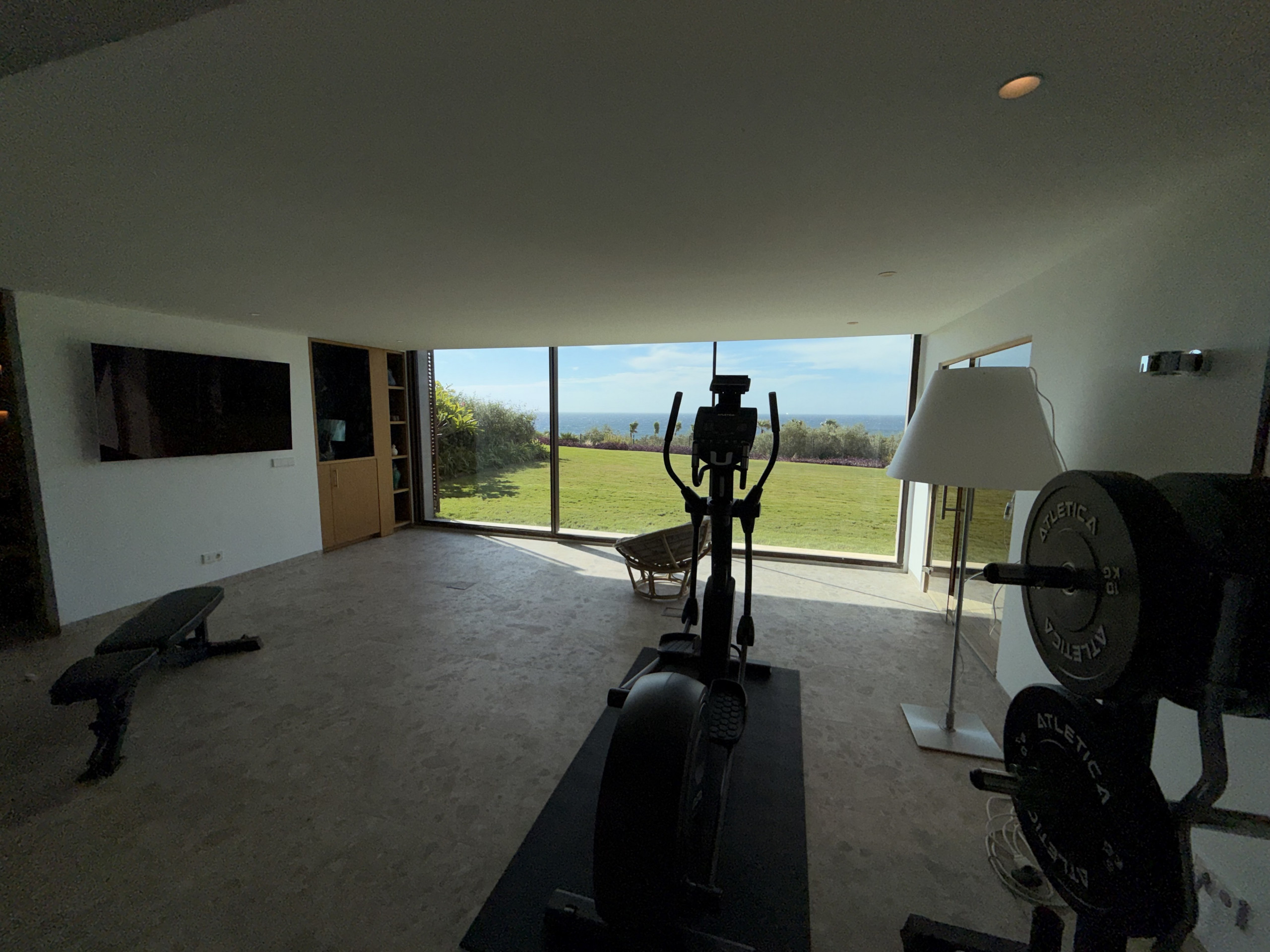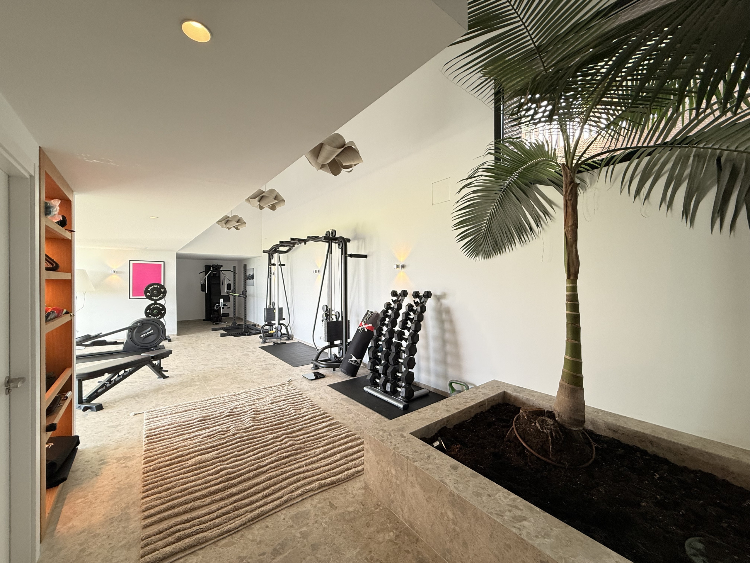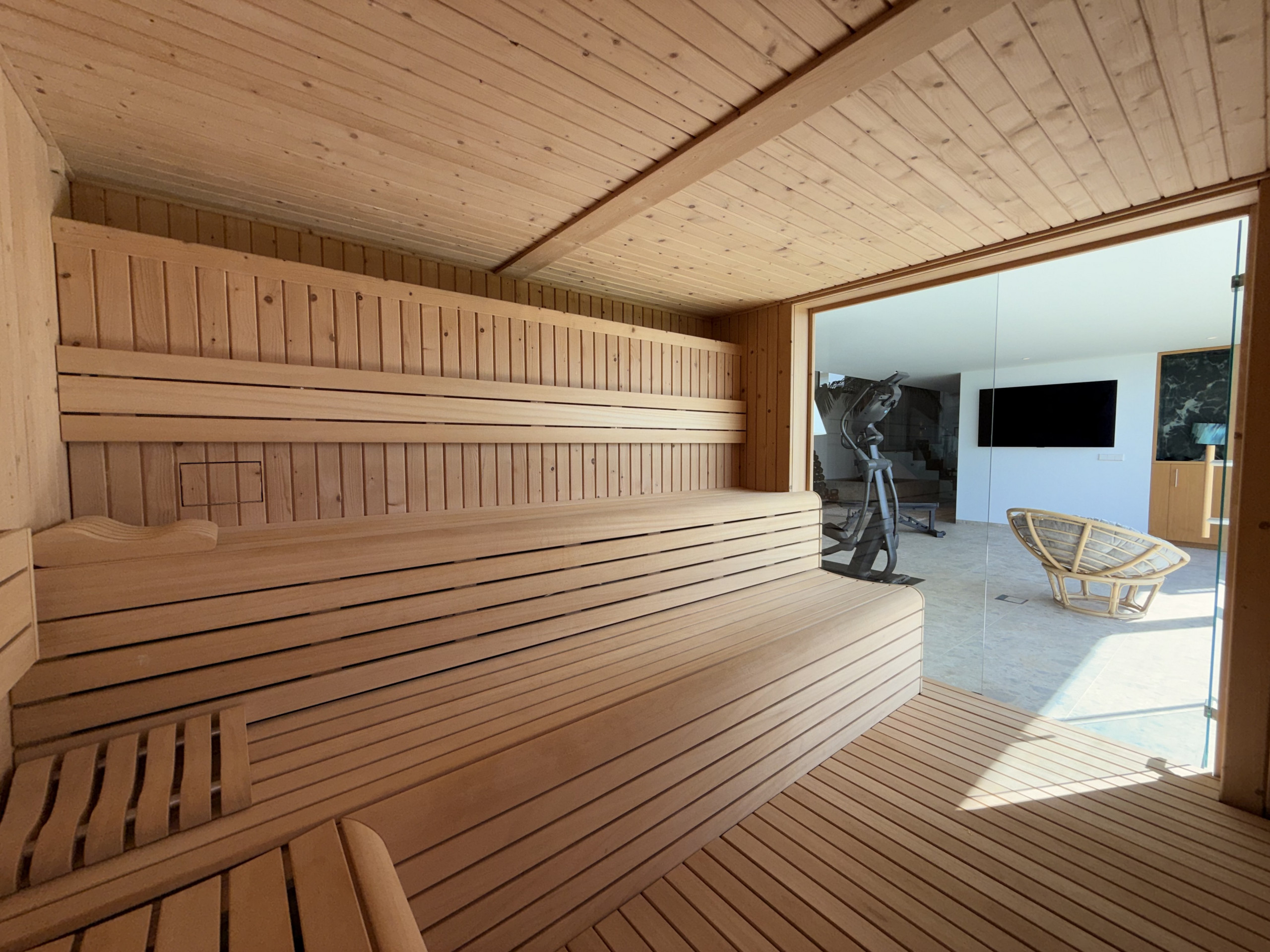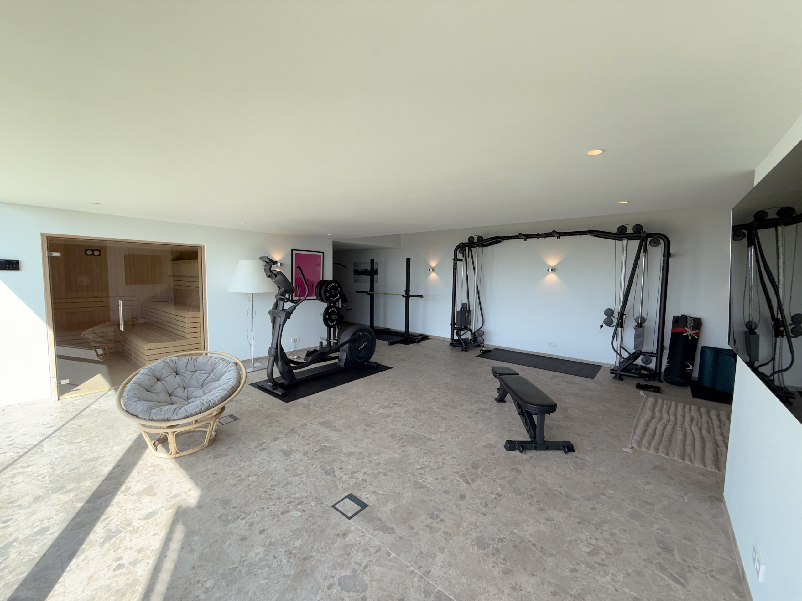 Auf der rechten Seite, hinter Essbereich und Küche, führt ein Flur zu zwei weiteren Schlafzimmern, gegenüber von zwei Bädern mit Dusche. Der Flur endet in einem Wellnessbereich: einem voll ausgestatteten Fitnessraum mit hochwertigen Geräten und Zubehör. Dieser Bereich verfügt außerdem über ein luxuriöses Bad mit zwei Duschen und einer großen Sauna mit Meerblick.