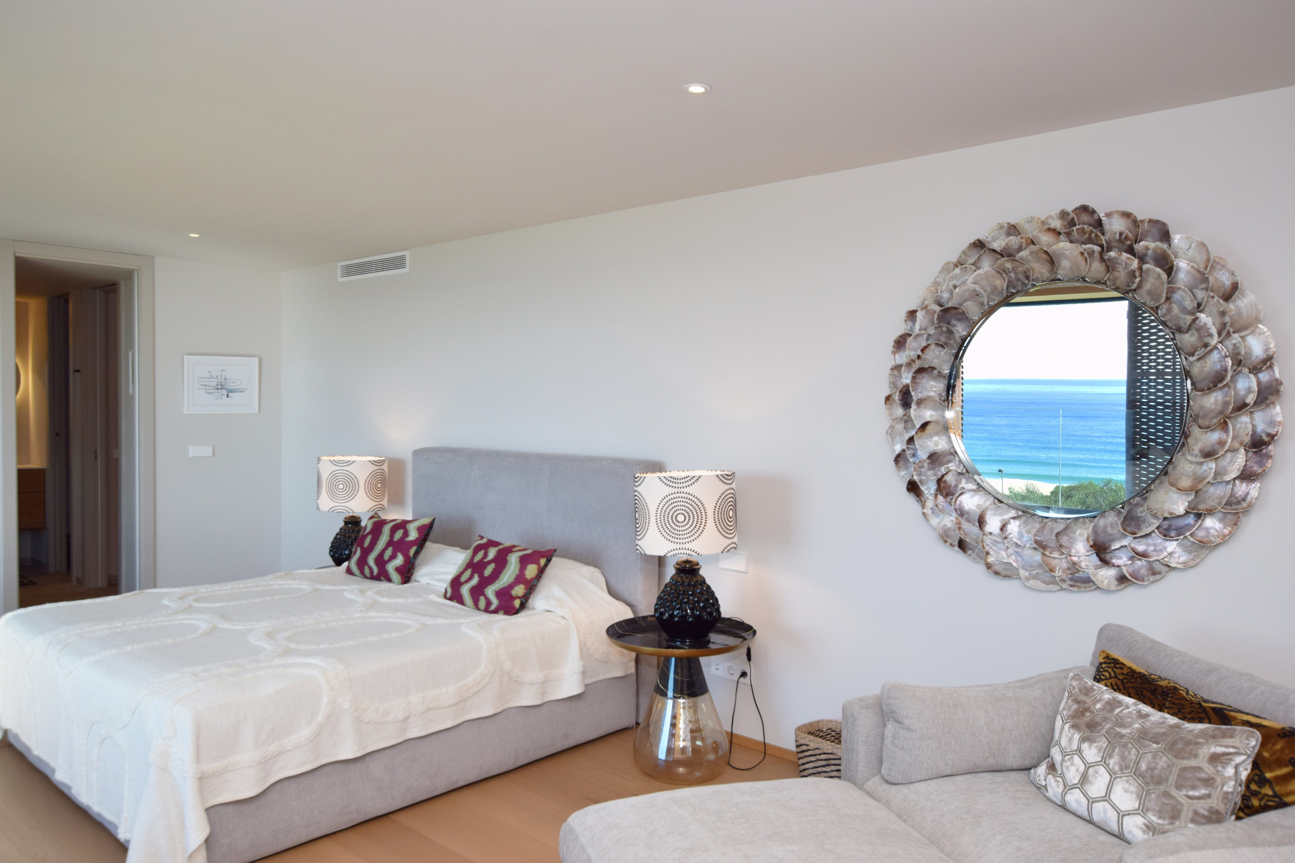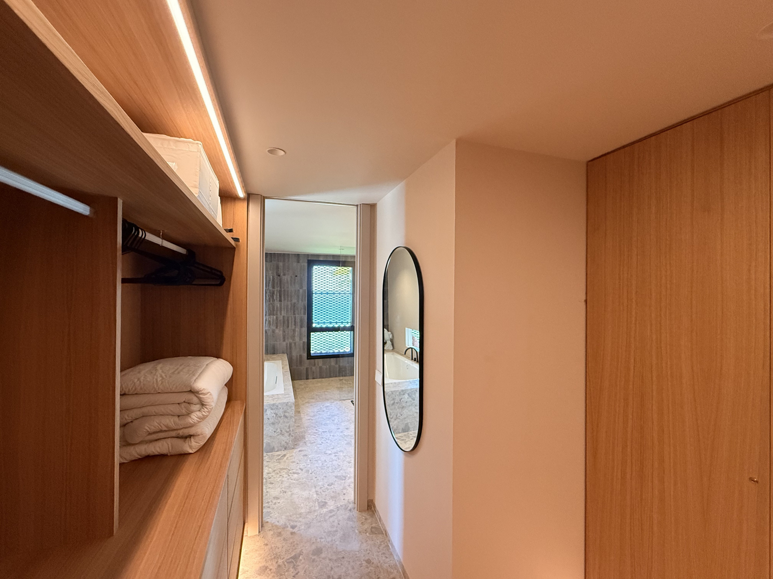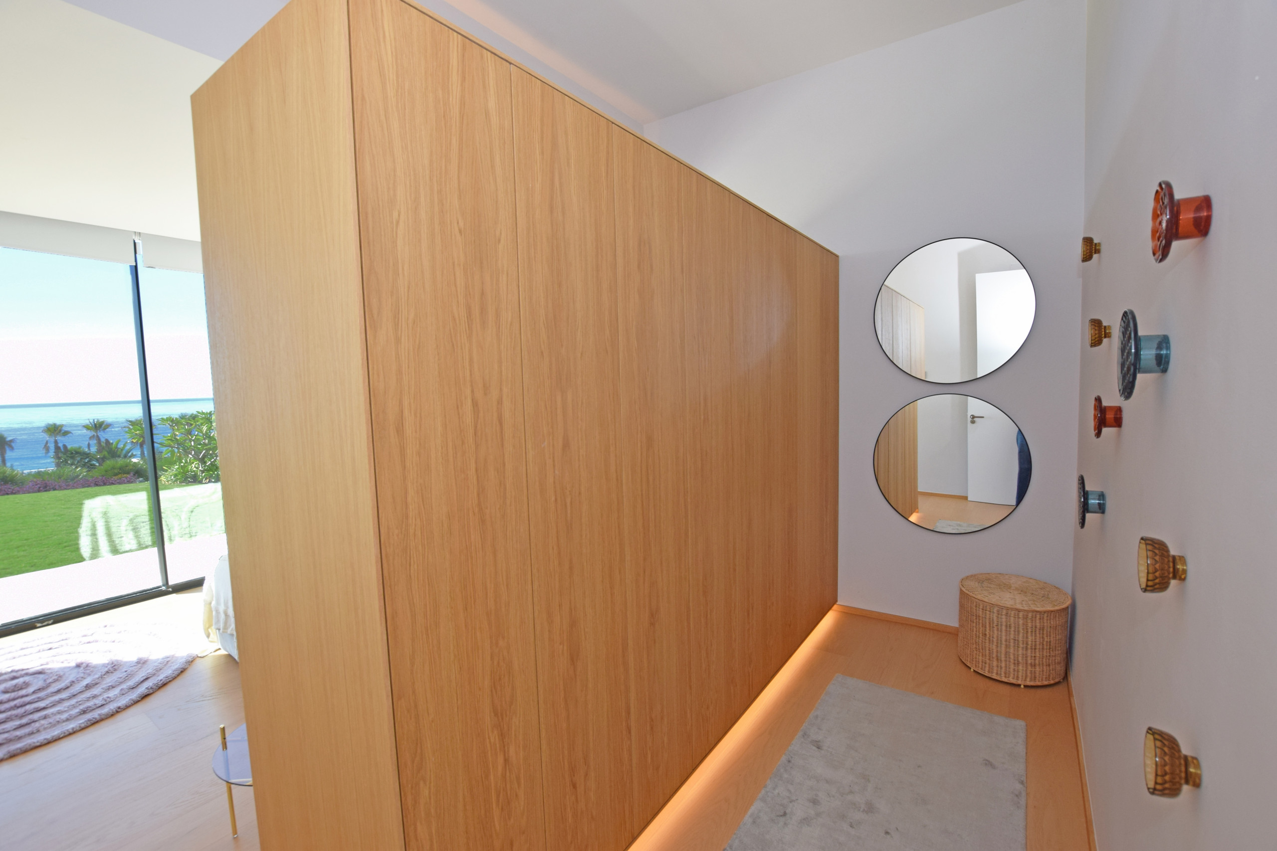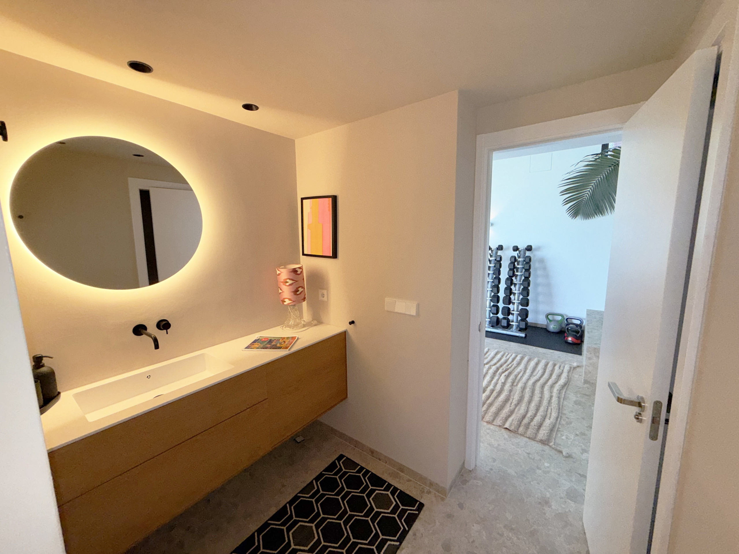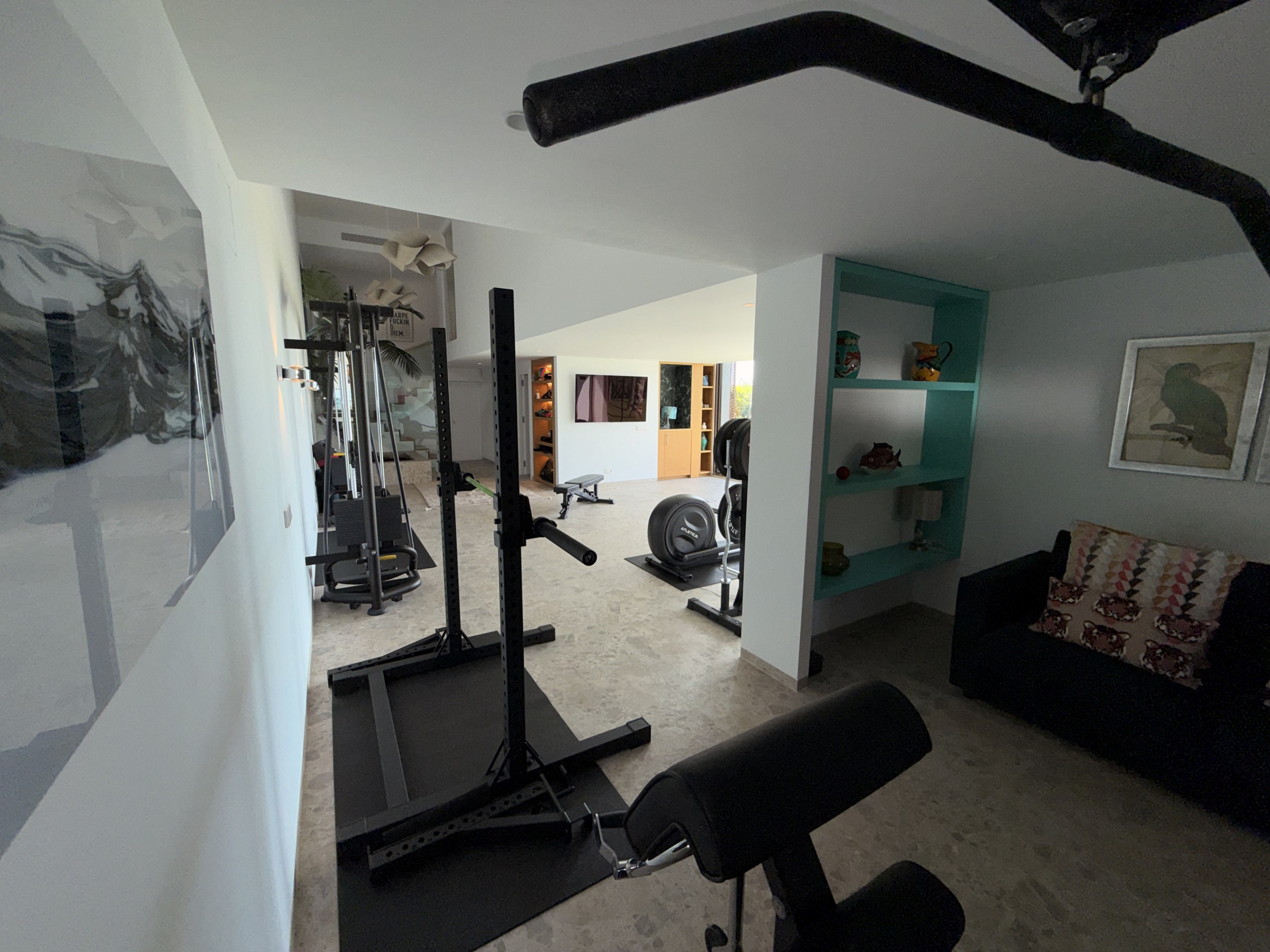 Auf der rechten Seite, hinter Essbereich und Küche, führt ein Flur zu zwei weiteren Schlafzimmern, gegenüber von zwei Bädern mit Dusche. Der Flur endet in einem Wellnessbereich: einem voll ausgestatteten Fitnessraum mit hochwertigen Geräten und Zubehör. Dieser Bereich verfügt außerdem über ein luxuriöses Bad mit zwei Duschen und einer großen Sauna mit Meerblick.