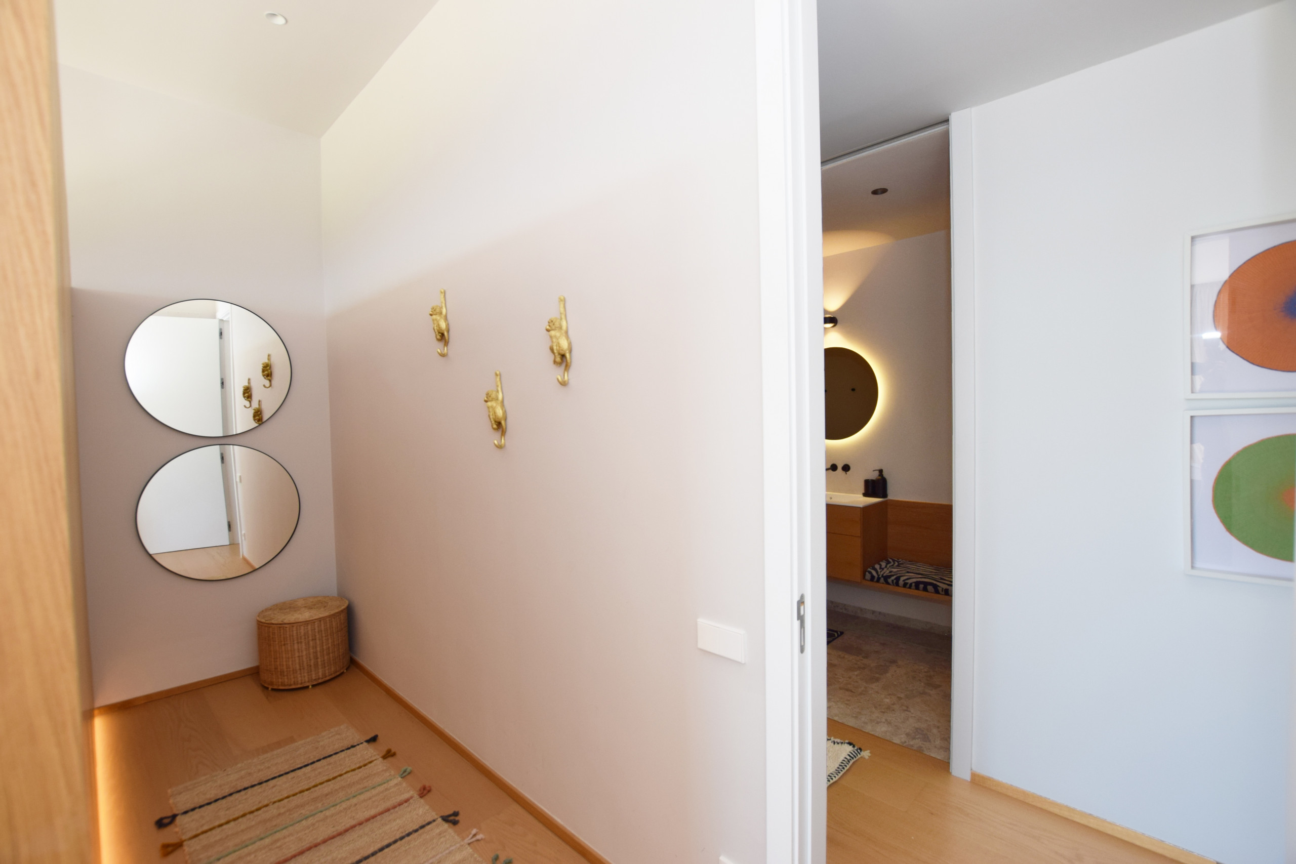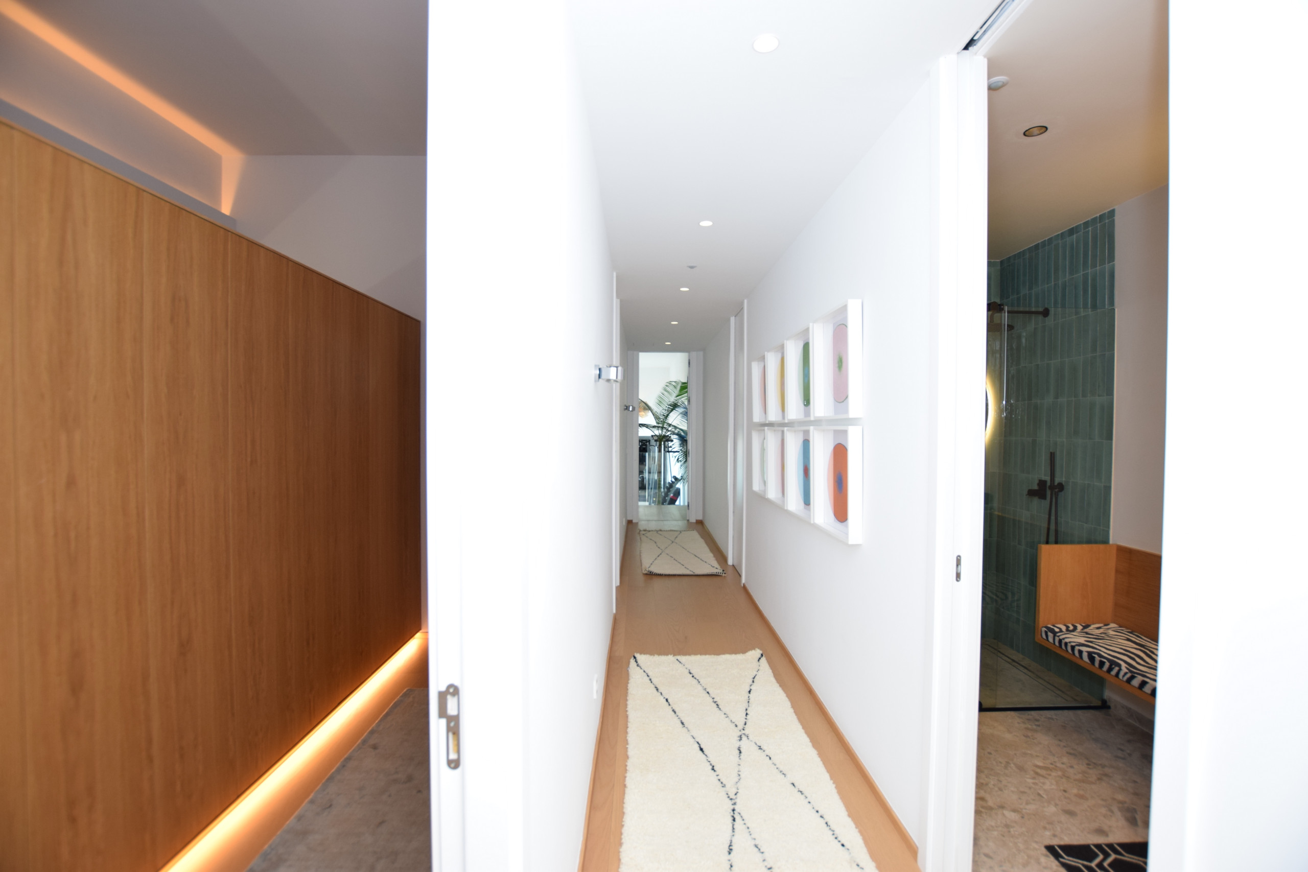 Auf der linken Seite der Treppe befindet sich ein privater Flur, der zu zwei Schlafzimmern führt, eines davon mit eigenem Bad und schönem Blick auf den Garten.