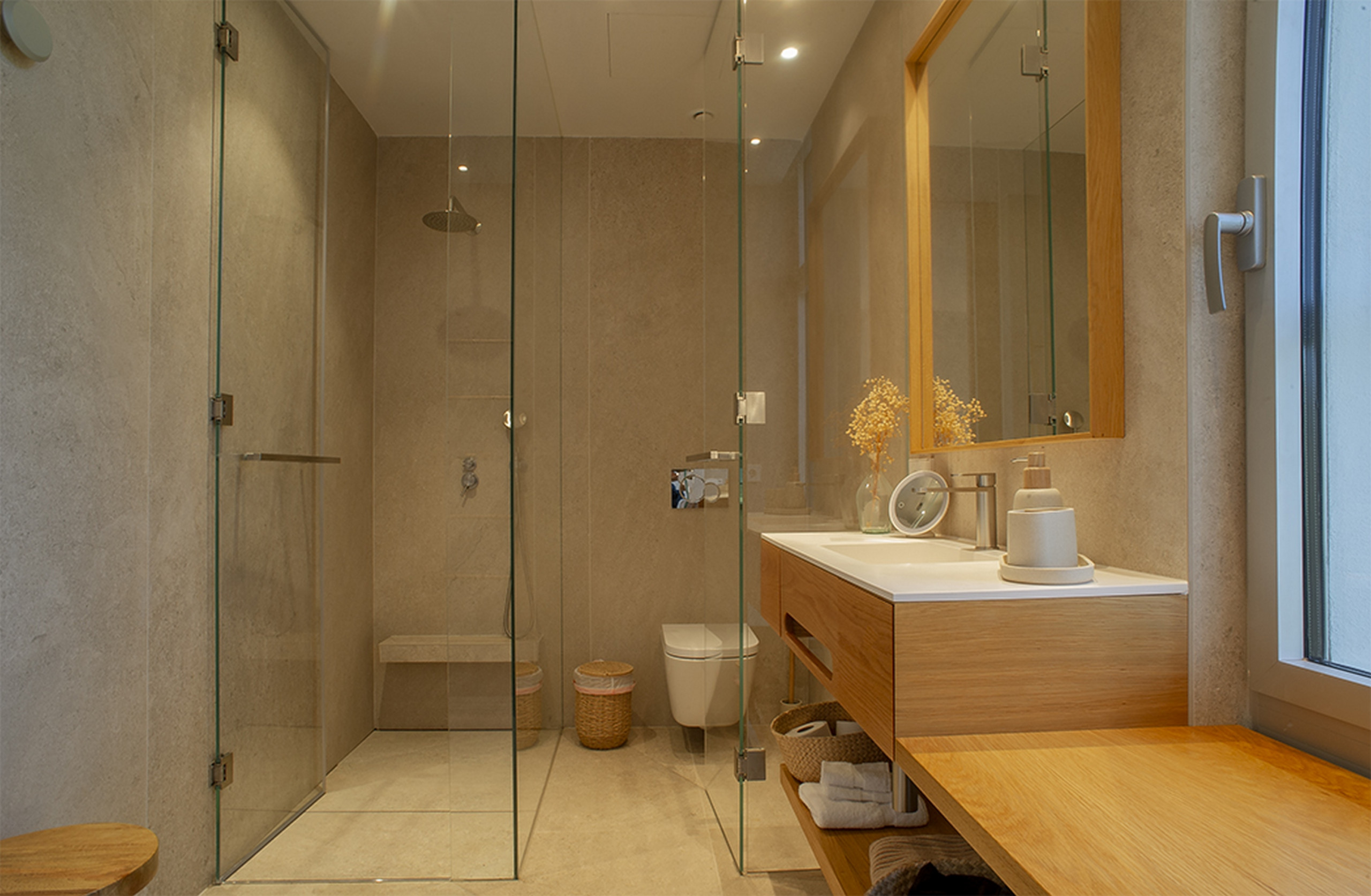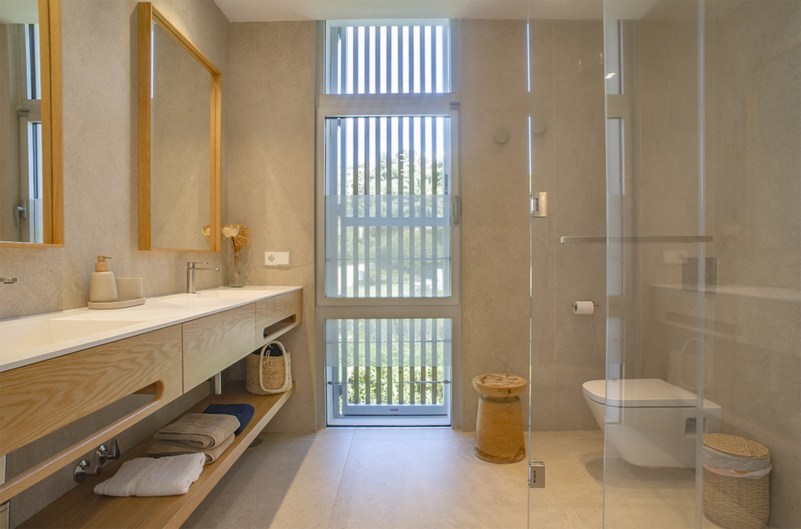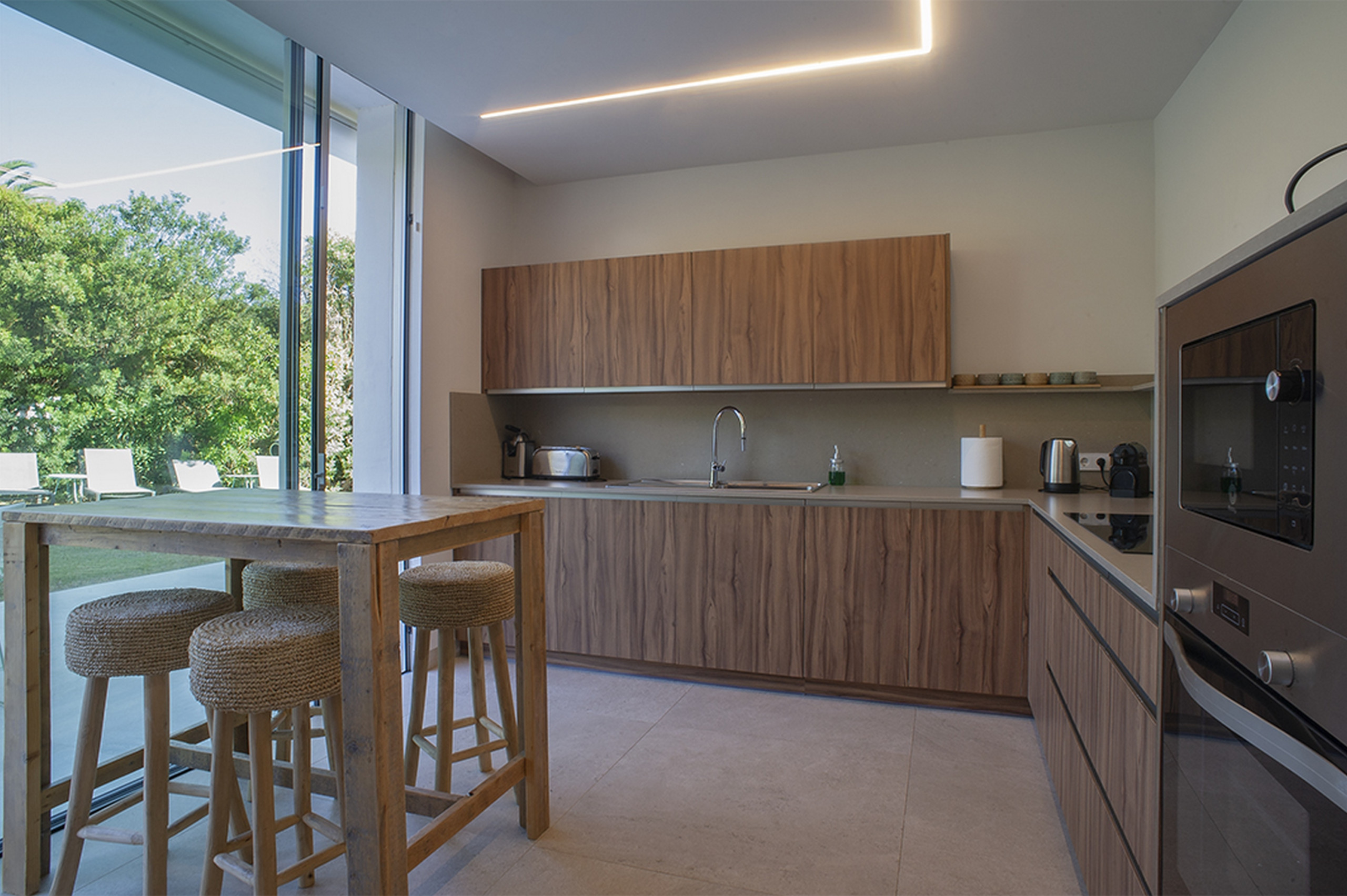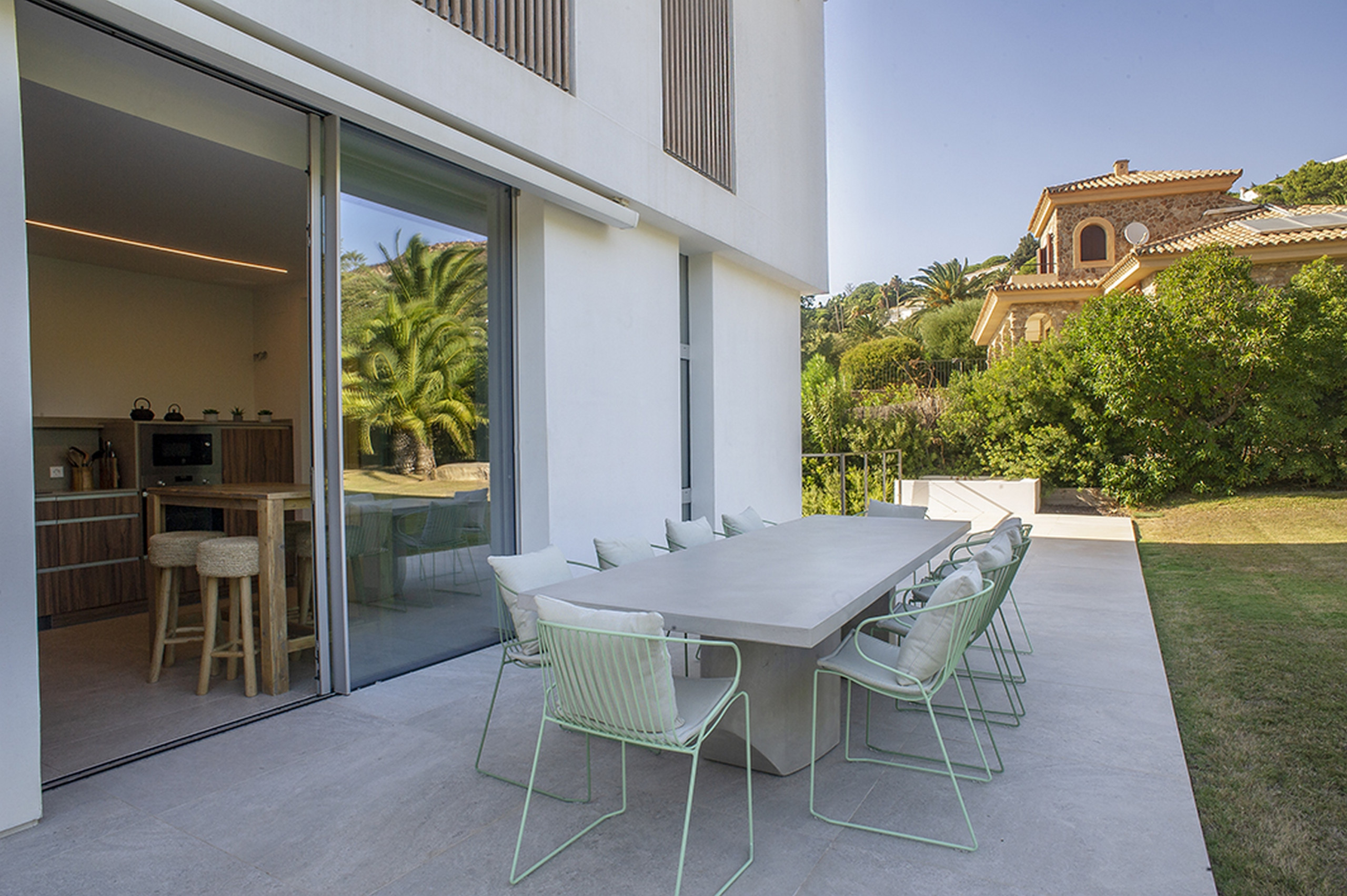 Im Erdgeschoss öffnet sich ein lichtdurchfluteter Salon-Speiseraum direkt zur Veranda und zum Poolbereich. Hier verschwinden die Grenzen zwischen Innen- und Außenraum. Ein gemütliches Wohnzimmer, perfekt zum Abschalten, und eine Traumküche - komplett ausgestattet - führen zu einem eleganten Außenessbereich mit Tisch, elektrischer Markise und Sonnenschirmen, der perfekte Schauplatz für lange Abendessen unter den Sternen. Ein vollständiges Badezimmer mit Dusche rundet dieses Niveau ab.