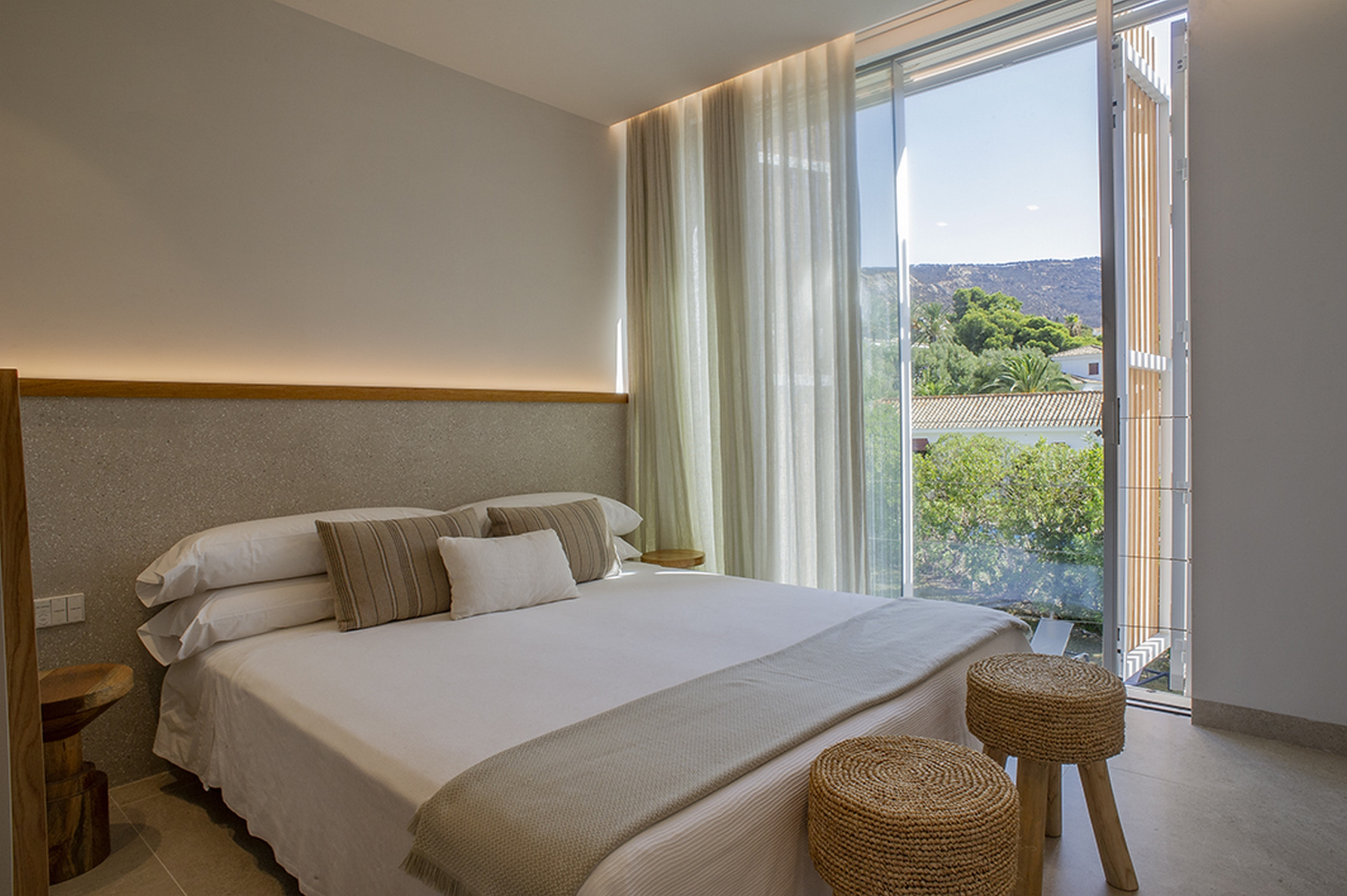 Oben bieten vier Schlafzimmer mit Badezimmer en Suite Erholung und Postkarten-Ausblicke: zwei mit Doppelbetten und Meerblick und zwei mit Einzelbetten, die auf den Garten und die Berge blicken. Von hier aus steigen Sie auf das Dach und entdecken die wahre Show: das Meer und die Berge, die sich bis zum Horizont erstrecken, der ideale Ort, um bei Sonnenuntergang anzustoßen.